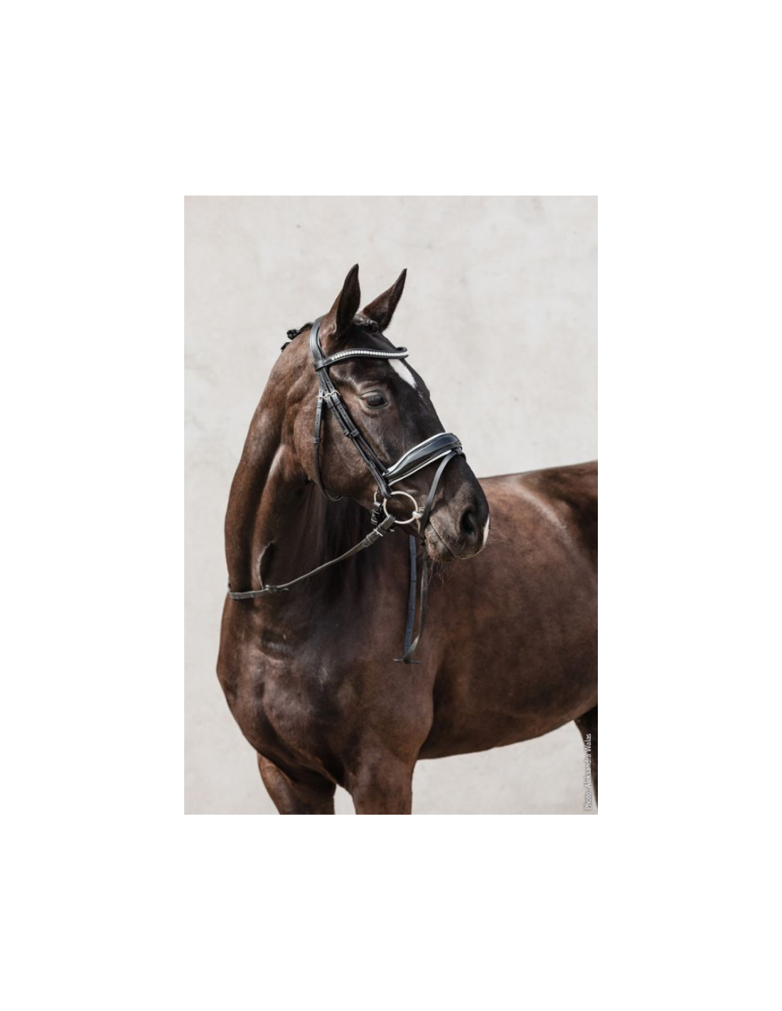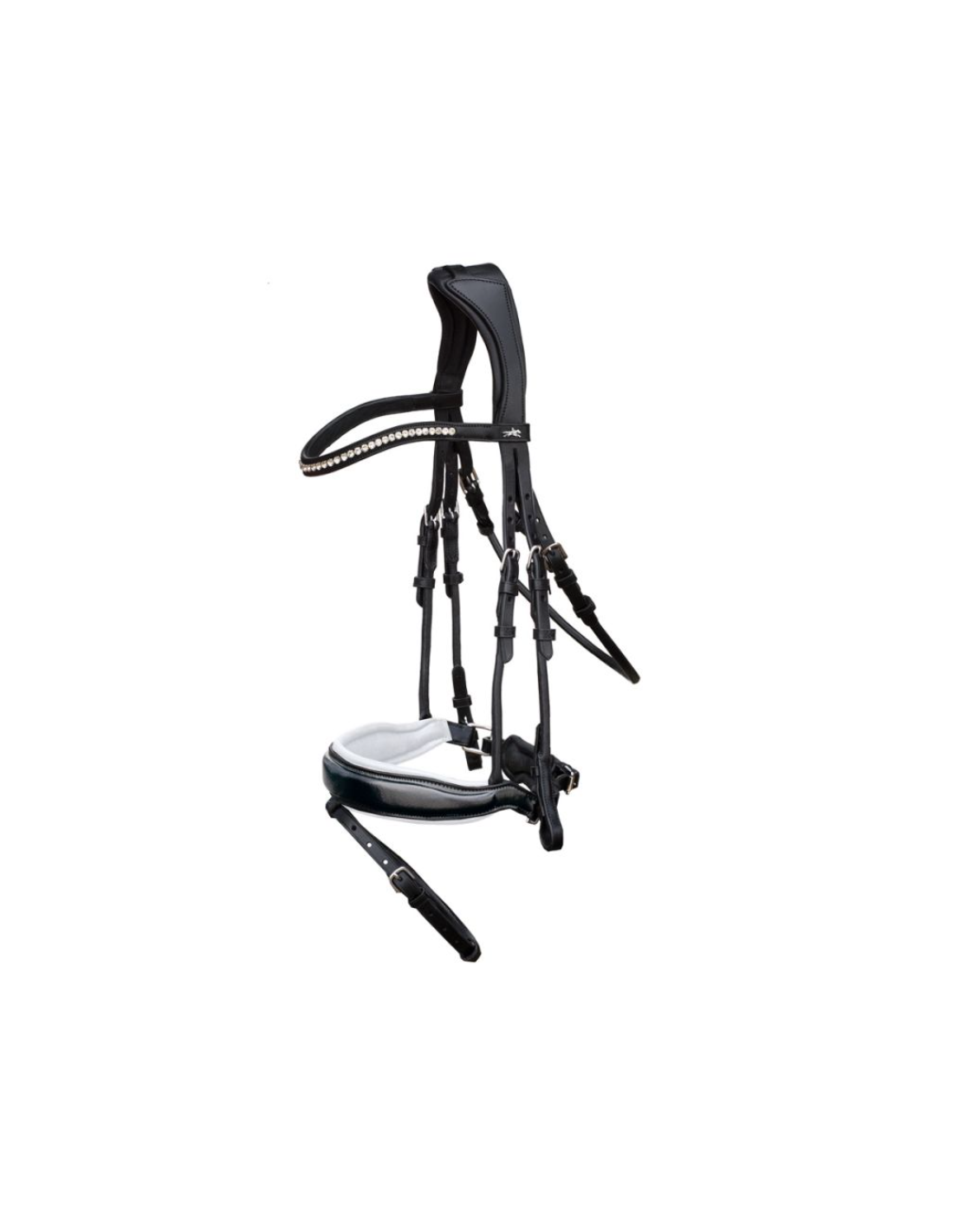 Le frontal incurvé orné de gros cristaux apporte élégance et style, et la sous-gorge réglable avec bouclerie métallique garantit un ajustement précis. Conçu pour les chevaux sensibles, ce bridon allie performance, confort et raffinement.