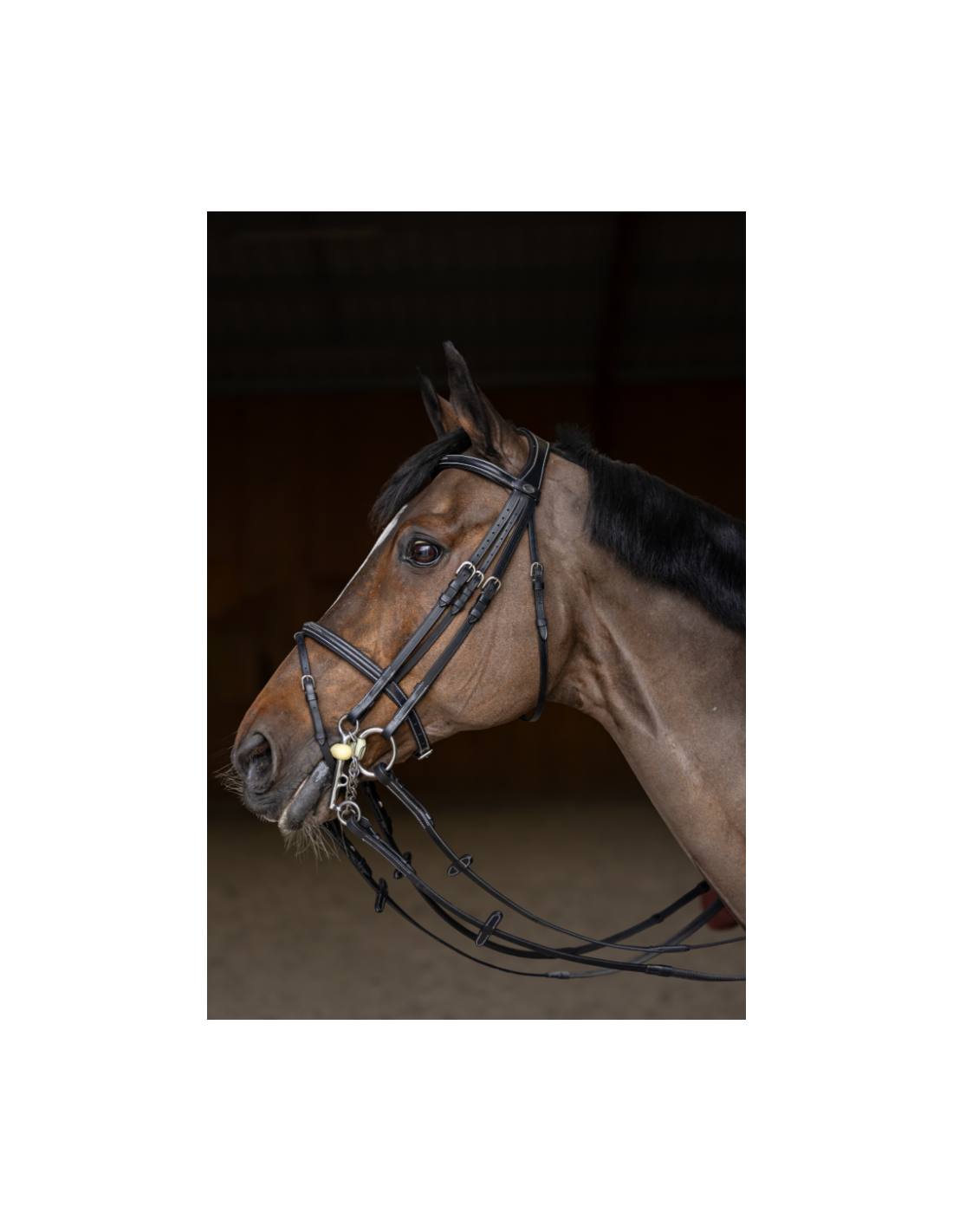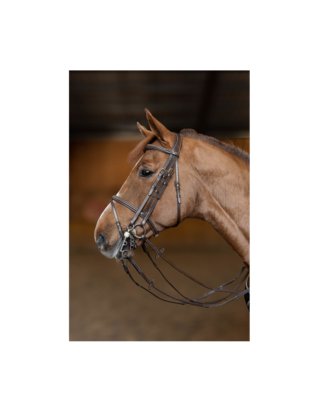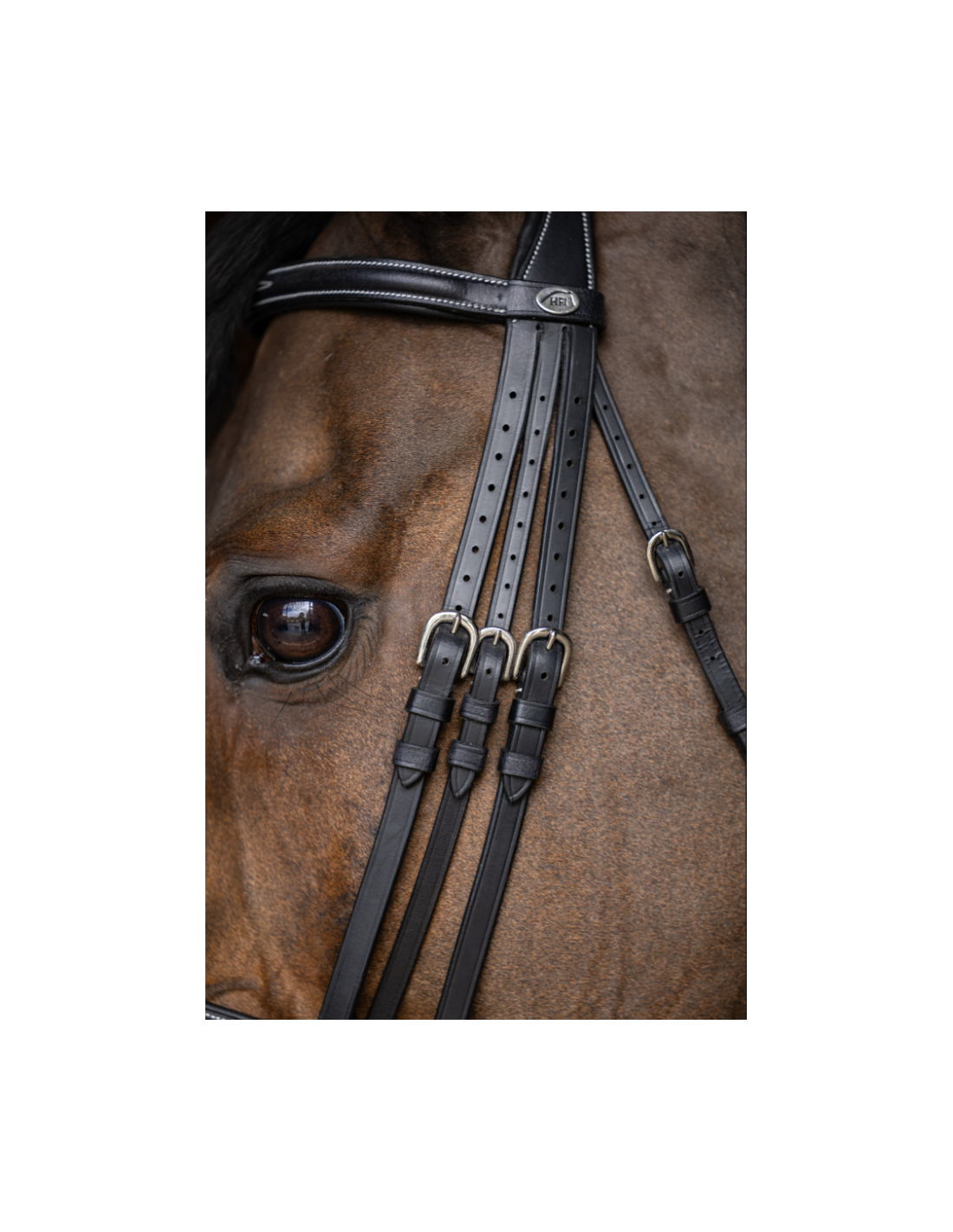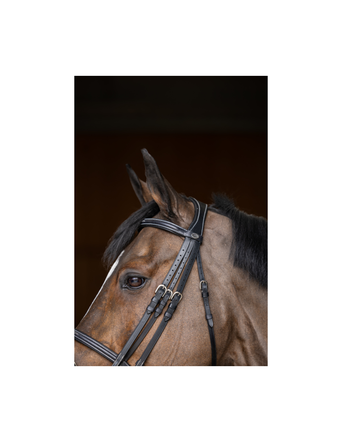 La bride est équipée d’une muserolle combinée doublée de cuir souple, idéale pour maintenir le mors en place et assurer un contrôle régulier sans compression excessive. Ce type de muserolle est apprécié pour son efficacité en jumping, en particulier pour les chevaux nécessitant un encadrement léger tout en conservant du confort.