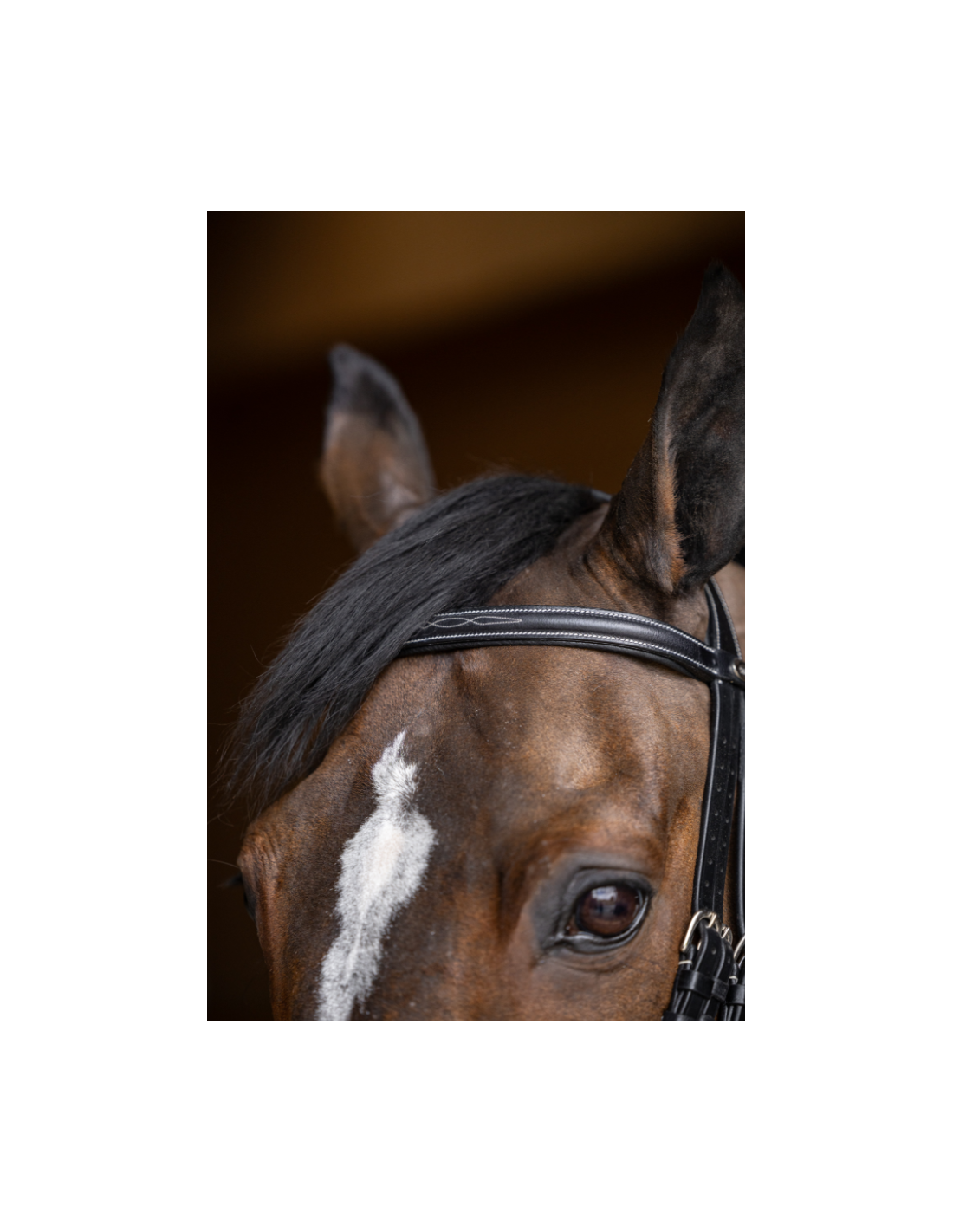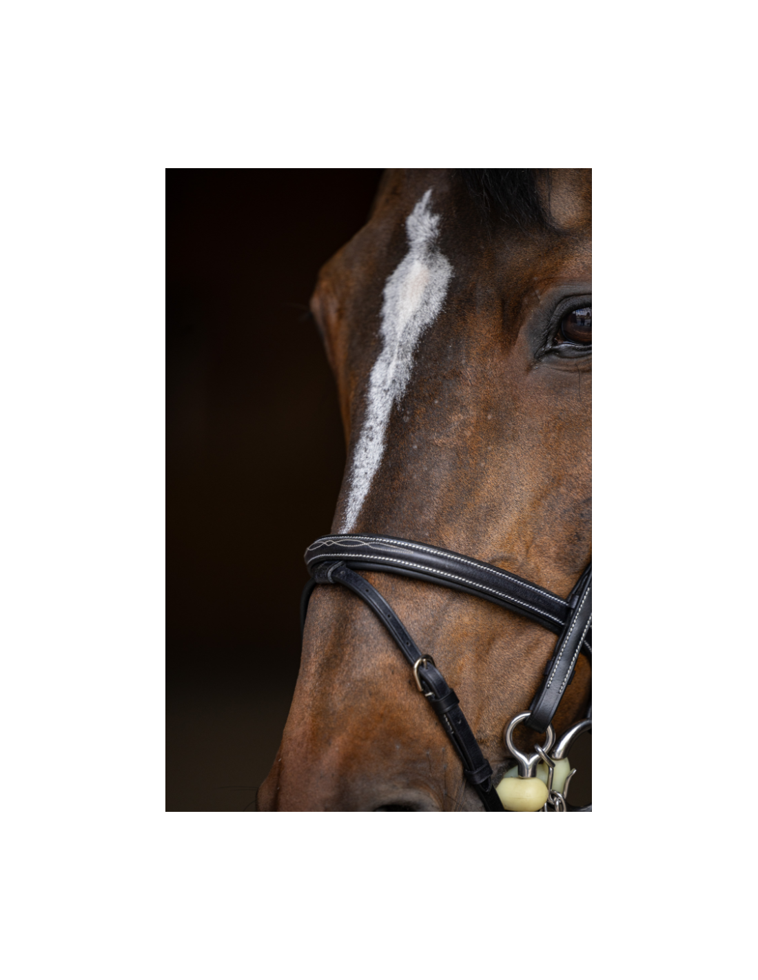 Le frontal, doublé de cuir souple, garantit un positionnement stable et agréable, tout en soulignant finement la ligne de tête. Les surpiqûres crème ajoutent un contraste discret mais élégant, renforçant l’esthétique de la bride et la qualité du travail artisanal. Ce détail contribue également à la solidité du cuir, assurant une longévité optimale de l’équipement.