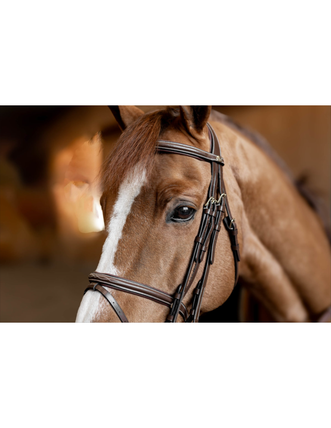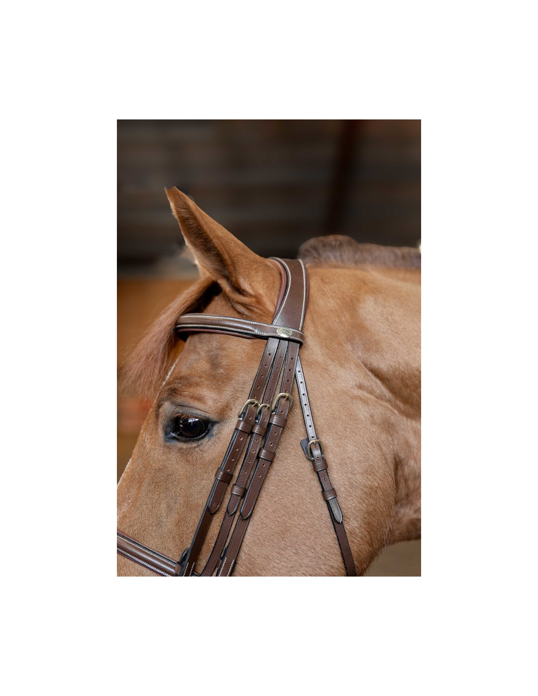 Le frontal, doublé de cuir souple, garantit un positionnement stable et agréable, tout en soulignant finement la ligne de tête. Les surpiqûres crème ajoutent un contraste discret mais élégant, renforçant l’esthétique de la bride et la qualité du travail artisanal. Ce détail contribue également à la solidité du cuir, assurant une longévité optimale de l’équipement.