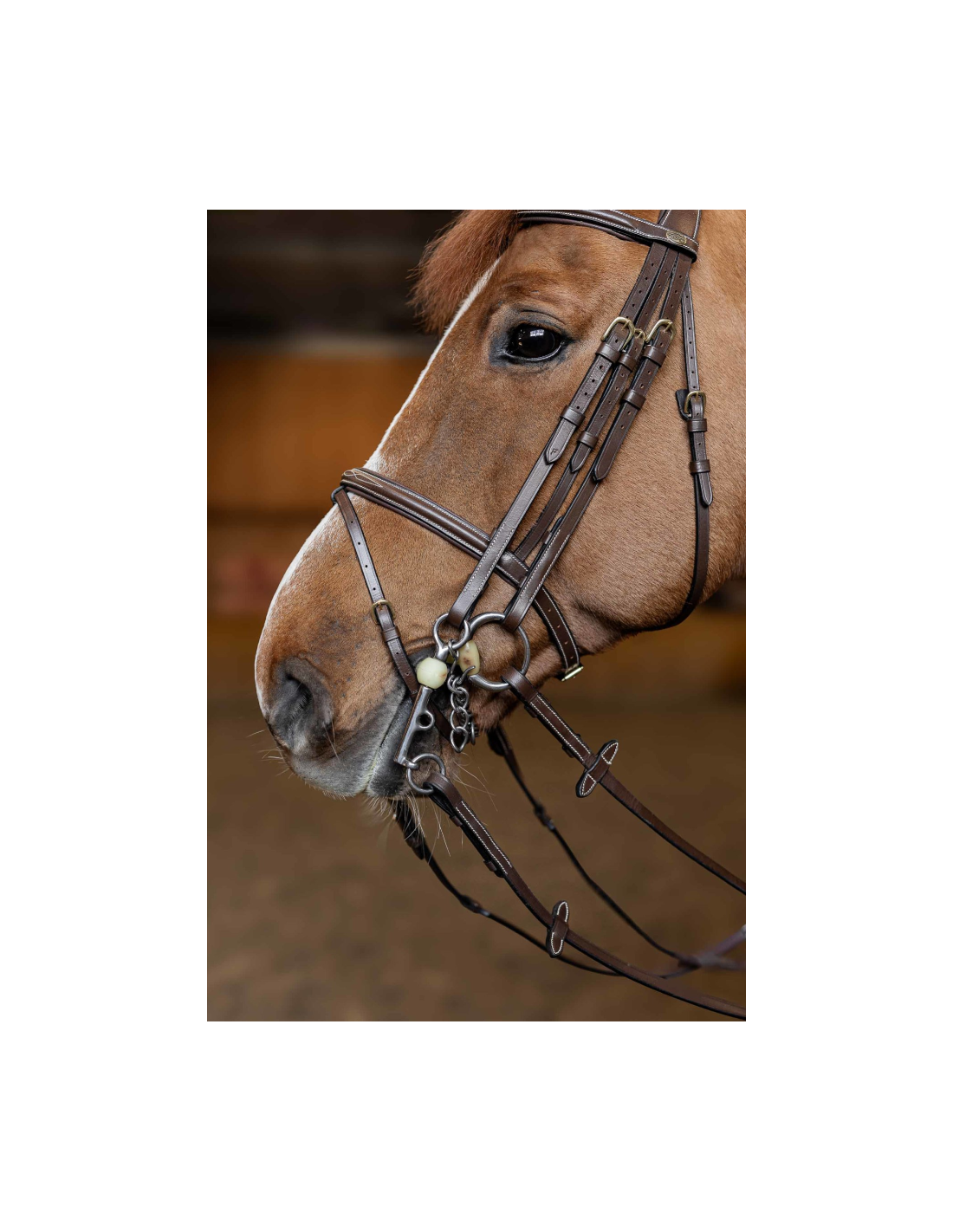 La bride est équipée d’une muserolle combinée doublée de cuir souple, idéale pour maintenir le mors en place et assurer un contrôle régulier sans compression excessive. Ce type de muserolle est apprécié pour son efficacité en jumping, en particulier pour les chevaux nécessitant un encadrement léger tout en conservant du confort.