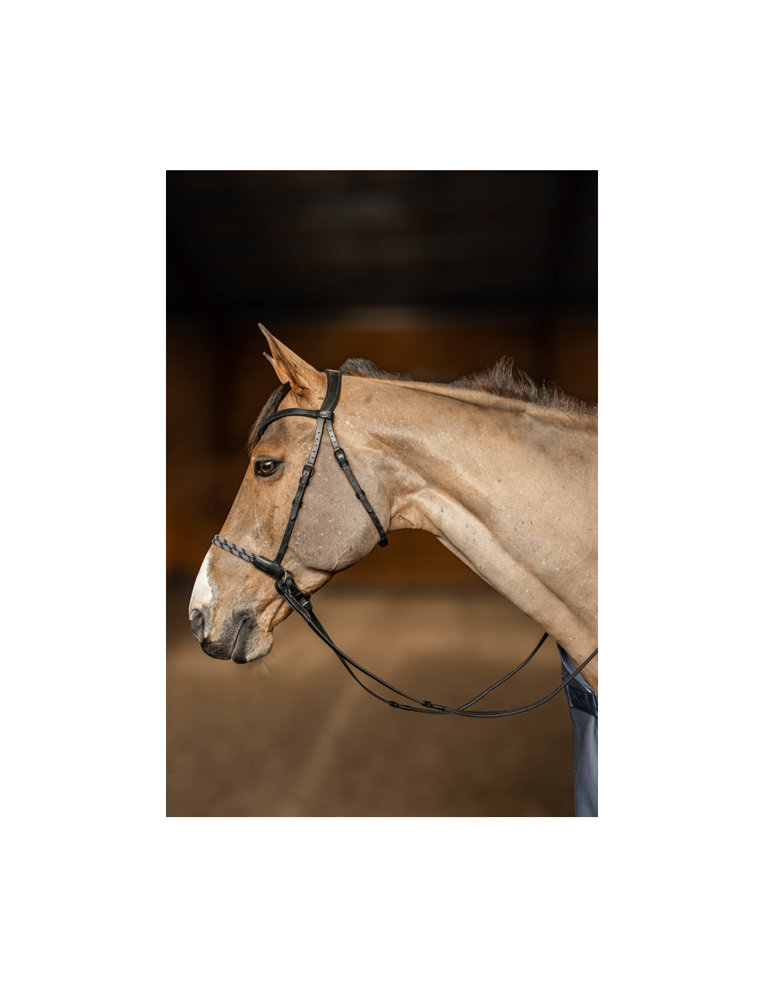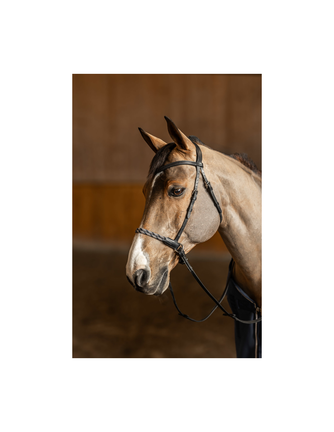 Ce bridon se distingue par sa têtière anatomique rembourrée et doublée de cuir souple, offrant un appui réparti de manière homogène derrière les oreilles du cheval. Cette conception permet de réduire les points de pression et d’améliorer le confort général, favorisant un cheval détendu et à l’écoute.
