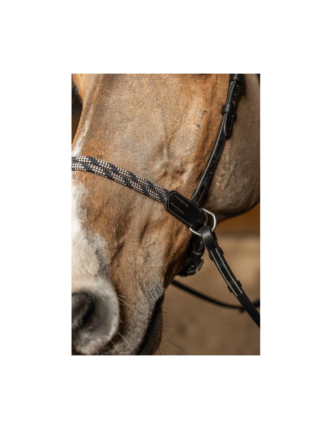 Le frontal anatomique, volontairement non doublé, conserve une belle finesse visuelle et s’intègre harmonieusement au reste du bridon. La muserolle en double corde bleu marine et blanche est l’élément central de ce modèle. Elle agit de manière douce mais efficace en transmettant les indications par contact léger, ce qui en fait une option idéale pour les chevaux sensibles ou pour un travail plus naturel.