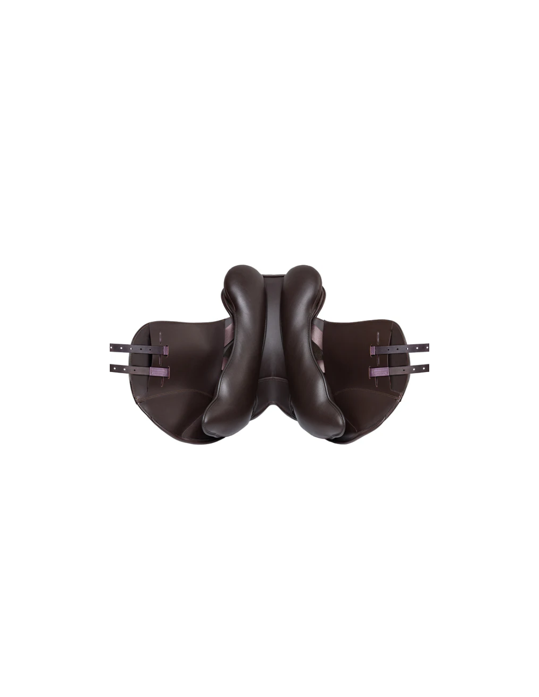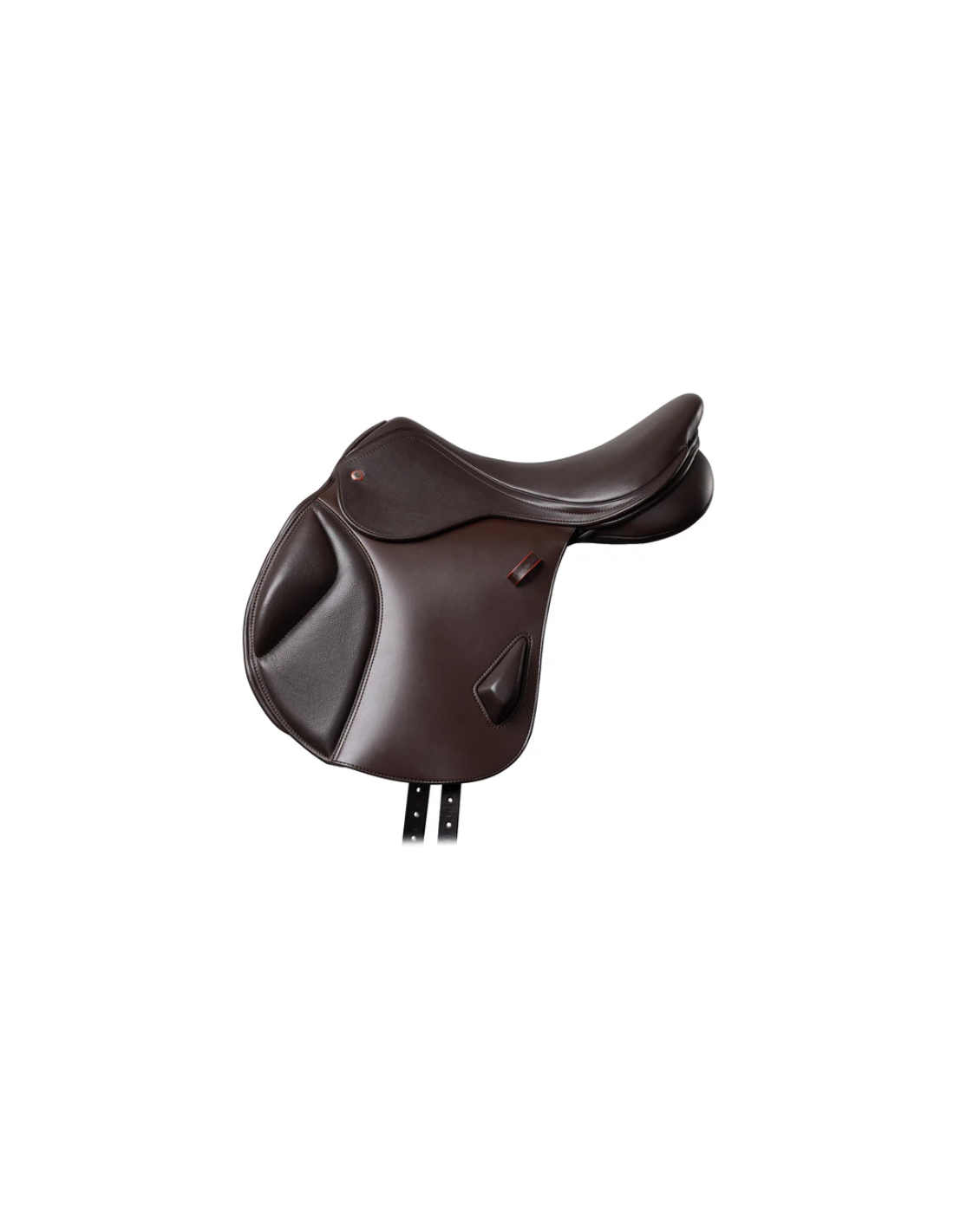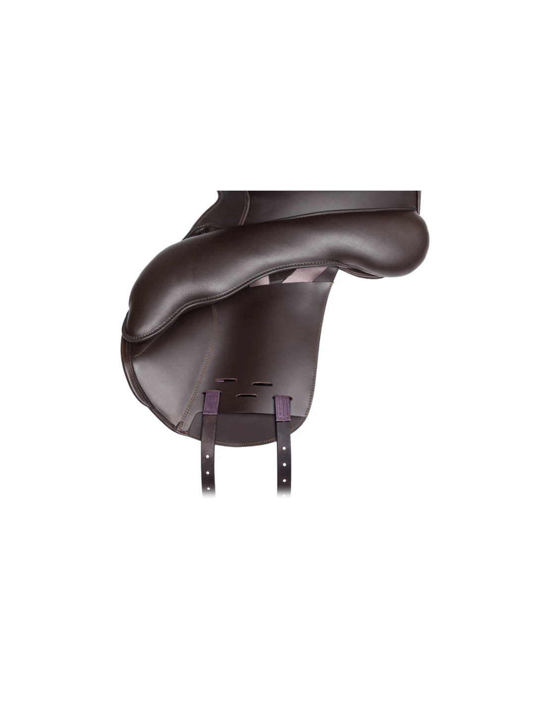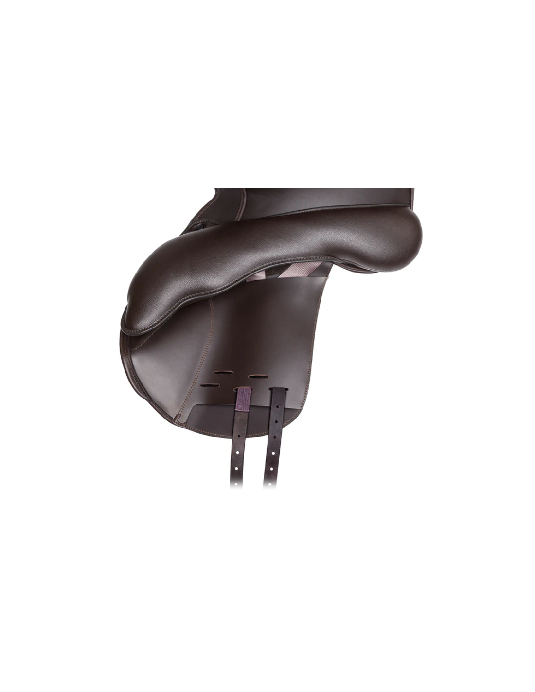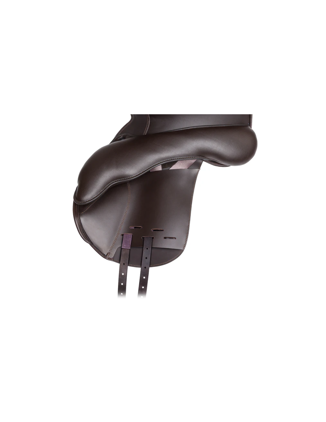 La selle est dotée d’un faible dévers qui permet au cavalier de déplacer son poids facilement, tout en maintenant son centre de gravité au-dessus des obstacles. Cette caractéristique est particulièrement appréciée en cross-country, où l’équilibre doit être constamment ajusté selon la vitesse, le terrain et les franchissements. Le siège ergonomique favorise une position naturelle et stable, réduisant la fatigue du cavalier tout en préservant le confort du cheval.