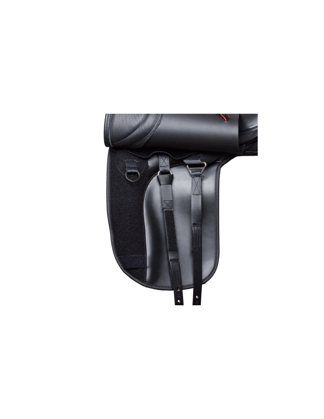 Toutes les zones stratégiques – siège et avancées de quartiers – sont renforcées avec un cuir souple haut de gamme. Ce choix de matériau assure un toucher agréable, une meilleure adhérence et une durabilité renforcée. Le cavalier profite ainsi d’une selle confortable et esthétique, conçue pour résister aux exigences de la pratique régulière.