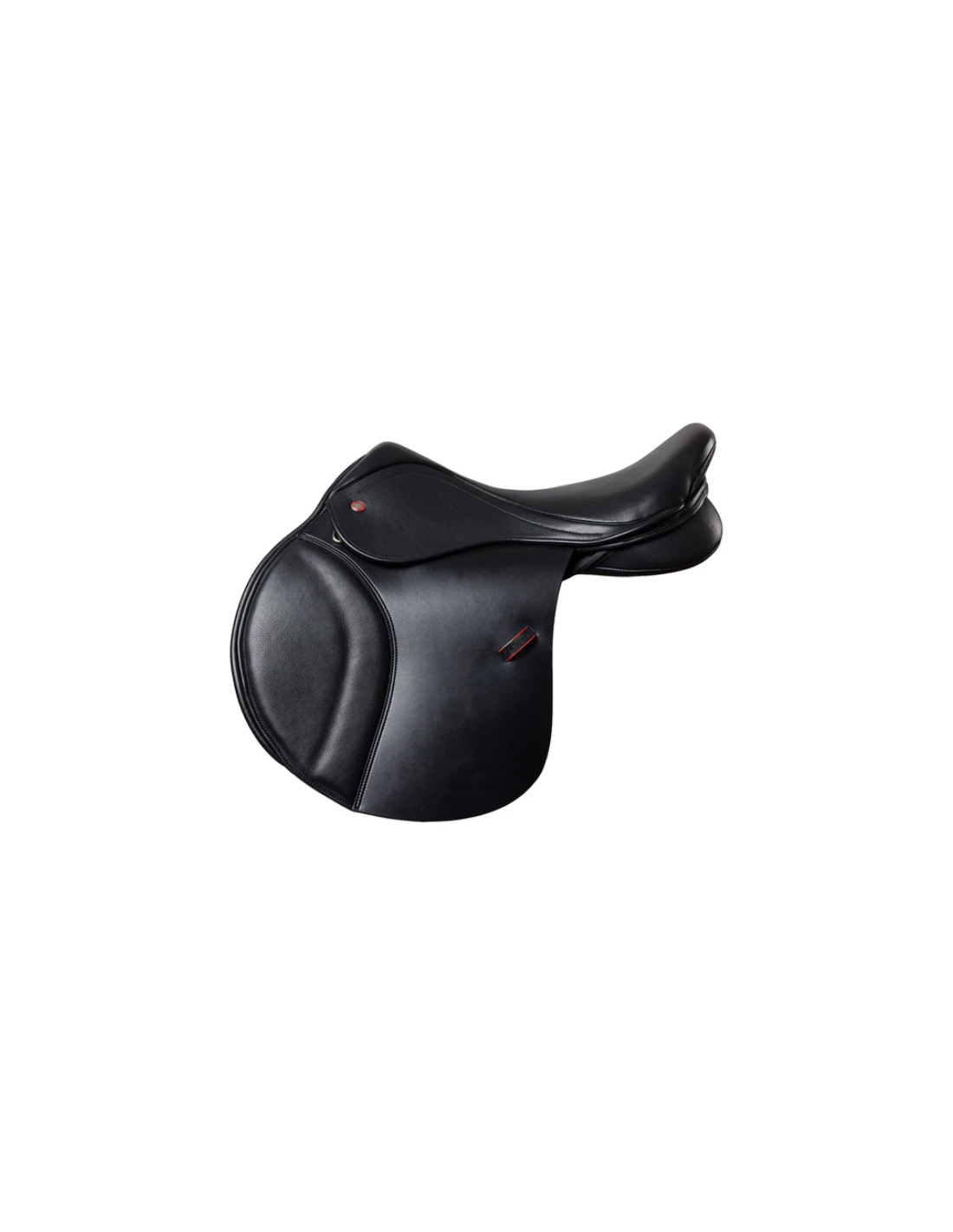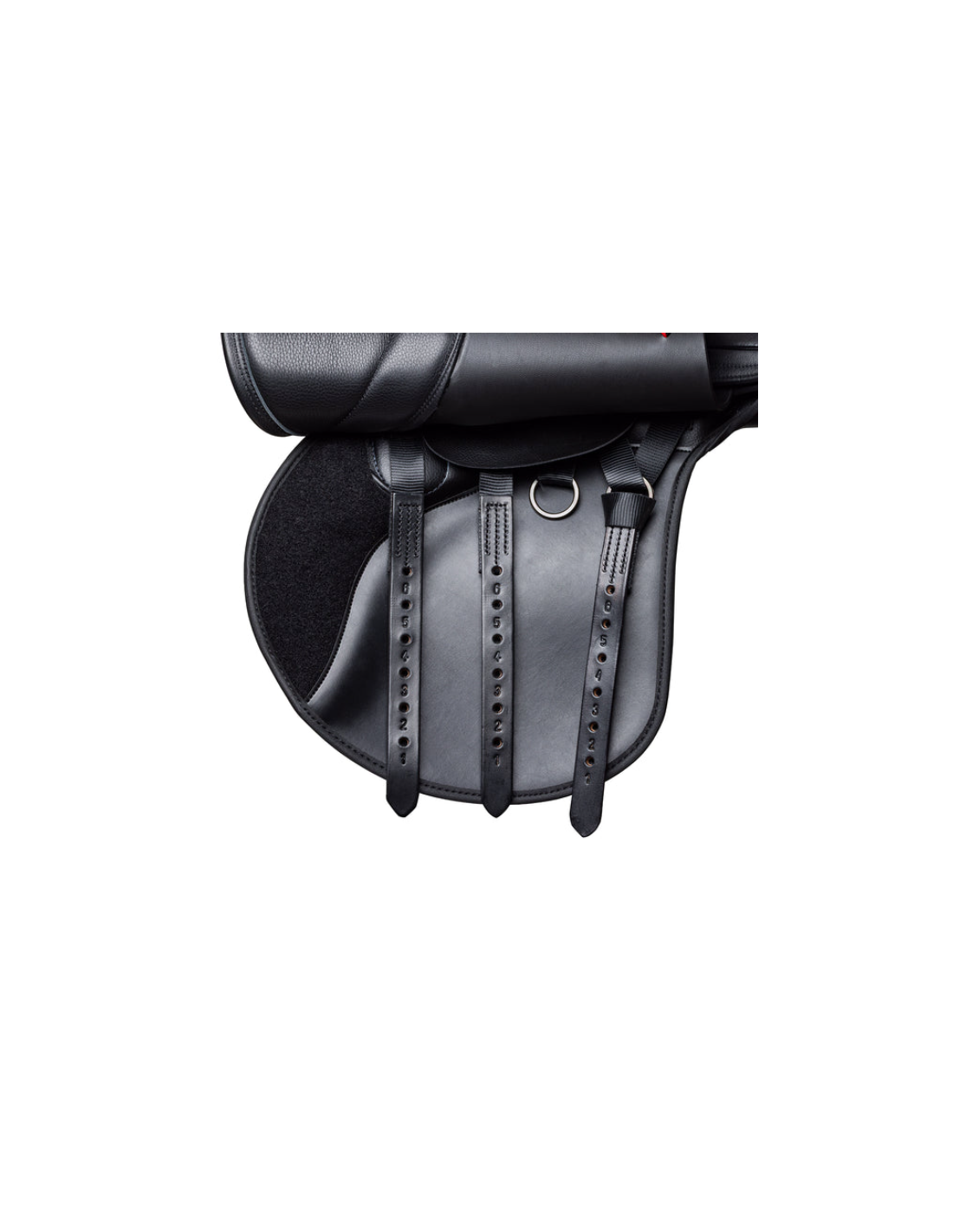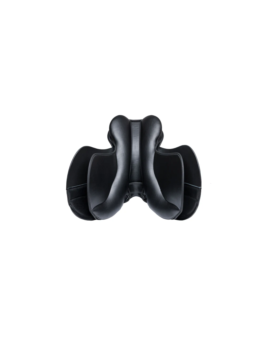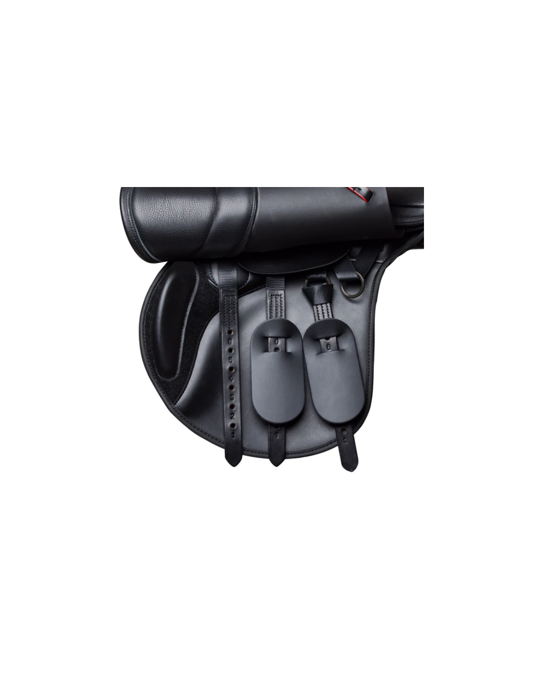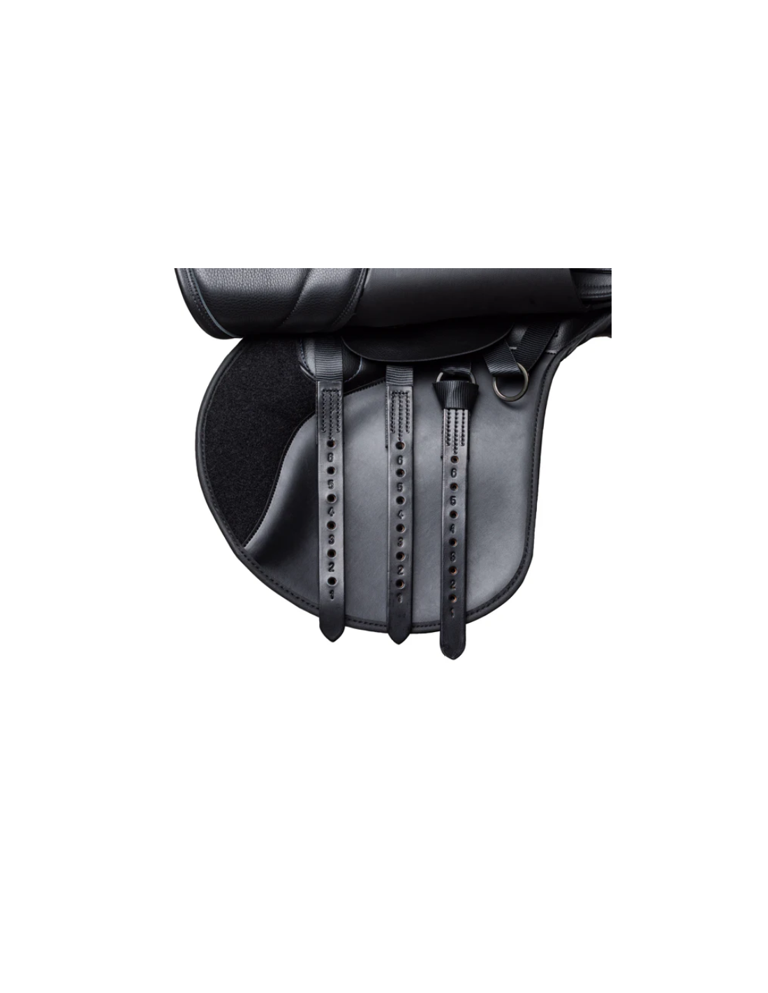 Tous les points de contact essentiels – siège et avancées de quartiers – sont habillés d’un cuir souple de qualité, garantissant confort et durabilité. Les taquets Velcro réglables et interchangeables permettent d’adapter le maintien des jambes en fonction de la morphologie et des préférences du cavalier. Cette personnalisation assure une position optimale et sécurisée, indispensable lors des phases de saut.