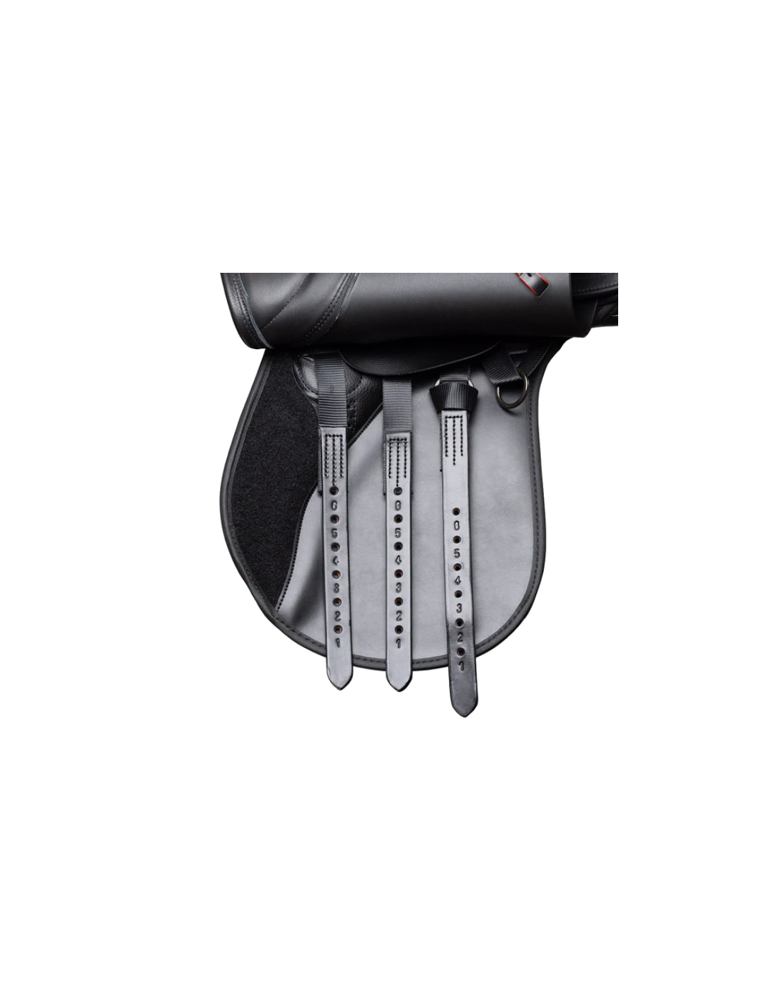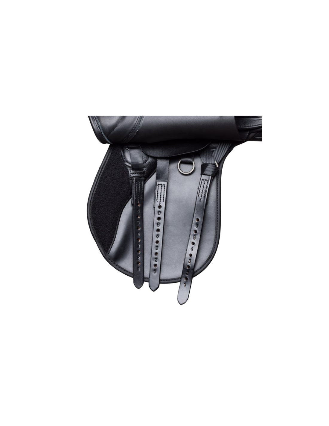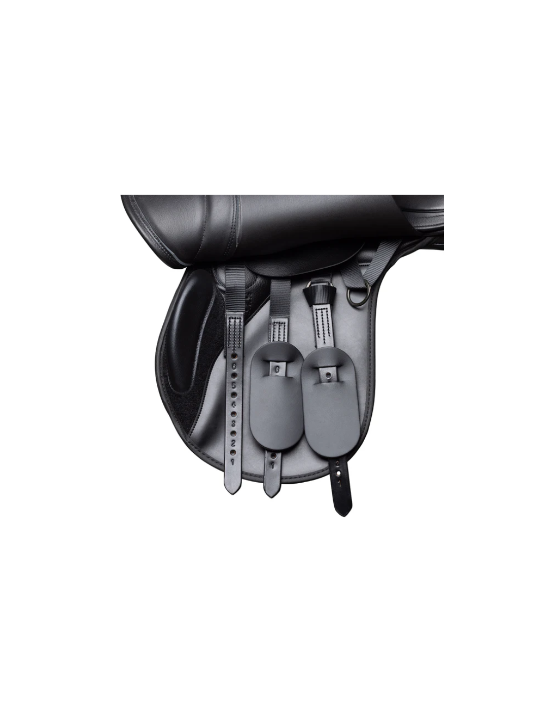 Afin d’assurer un contact agréable et une assise confortable, cette selle intègre un cuir souple et résistant sur toutes les zones stratégiques : le siège et les avancées de quartiers. Ces finitions haut de gamme garantissent non seulement un meilleur confort du cavalier, mais aussi une durabilité renforcée pour un usage régulier, que ce soit à l’entraînement ou en compétition.