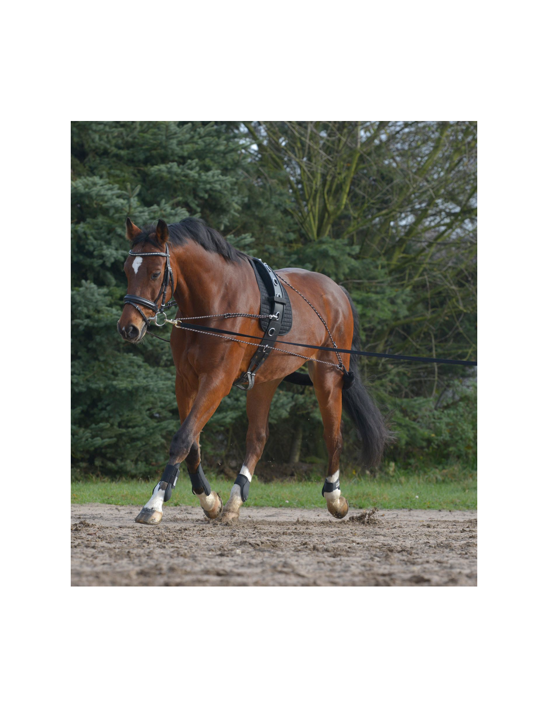 L’enrênement est doté d’un matelassage doux à l’arrière-main, assurant un confort optimal et réduisant les points de pression pendant le travail. Ce détail technique permet de travailler plus longtemps avec le cheval sans gêne ni irritation. L’enrênement est livré sans longe ni surfaix, laissant la possibilité au cavalier de l’adapter selon ses besoins et son matériel existant.