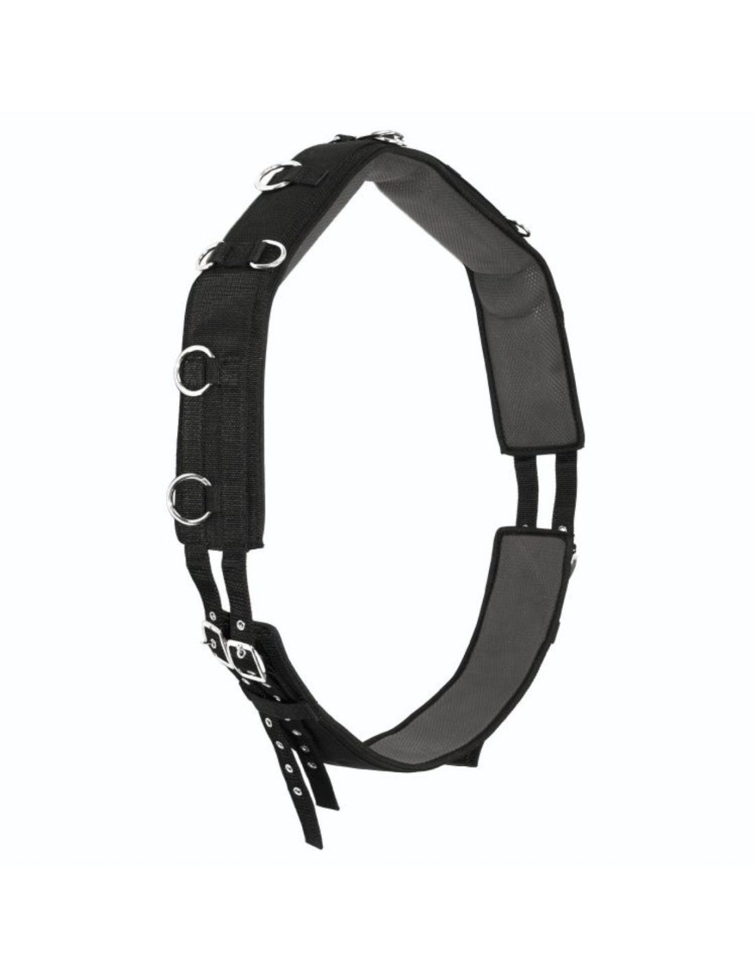 Le surfaix est équipé de dix anneaux en D solidement fixés par des sangles résistantes et répartis de manière uniforme sur toute sa longueur. Ces anneaux offrent de multiples possibilités de réglage, permettant de fixer différents enrênements et aides à l’entraînement selon les besoins du cavalier : élastiques, pessoa, gogue, enrênement à poulies, etc.