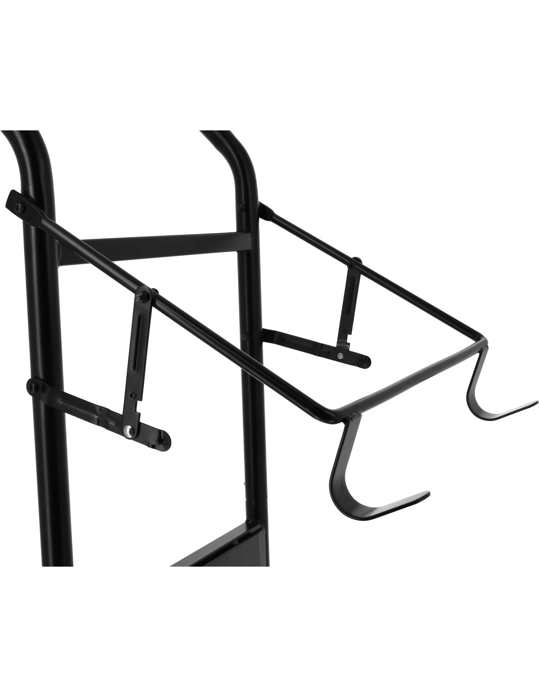 Le chariot porte-selle Hippotonic est équipé de crochets pratiques permettant de suspendre un bridon ou un licol, ainsi que d’un porte-selle et d’un support pour tapis. Chaque élément est pensé pour maintenir le matériel correctement en place pendant les déplacements, tout en facilitant l’accès rapide aux équipements.