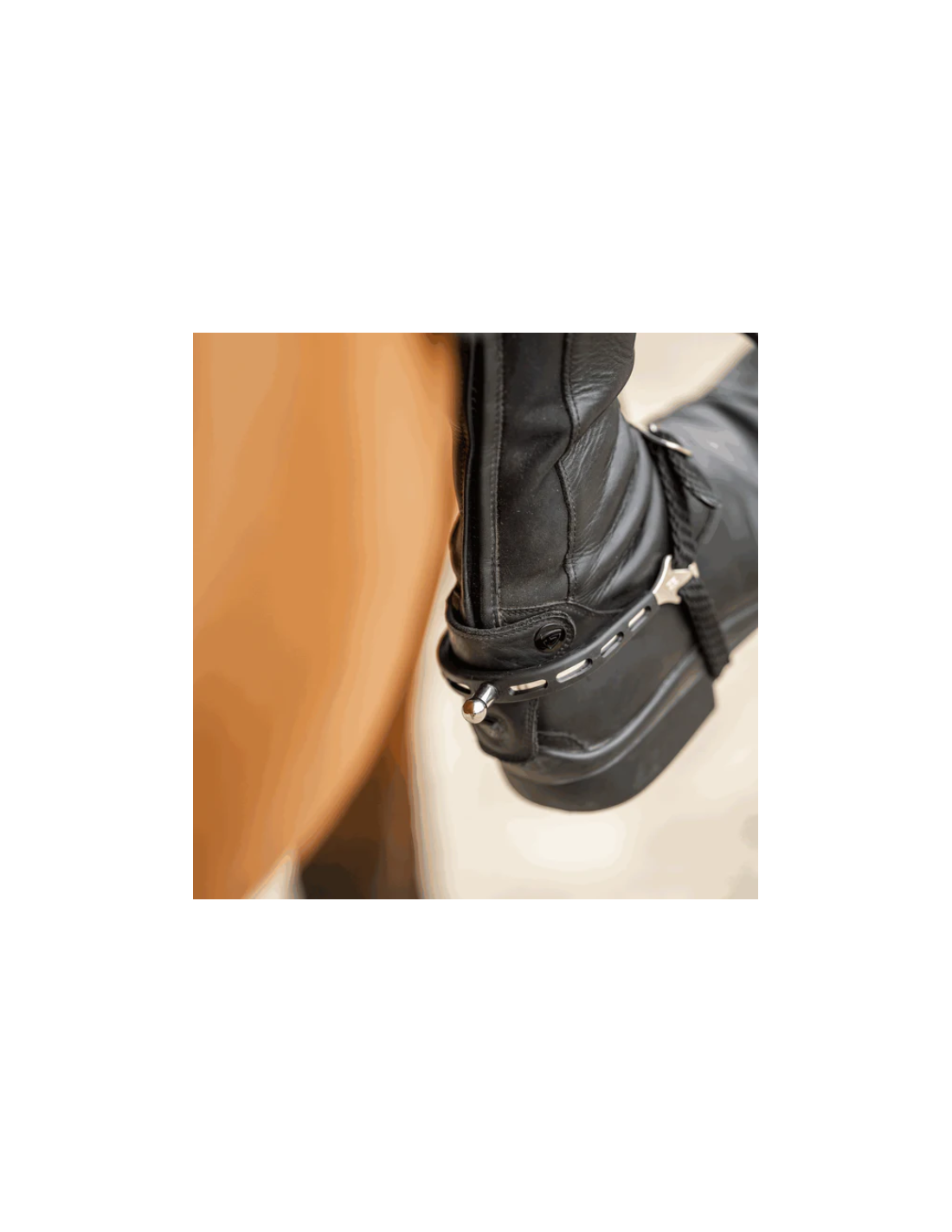La fixation Balkenhol, développée par Sprenger, se distingue par sa boucle de sangle innovante avec barre centrale évasée vers l’extérieur. Cette conception permet à la lanière d’éperon de passer à l’intérieur de la botte, assurant un ajustement confortable, sûr et discret, sans pincement ni déplacement involontaire.