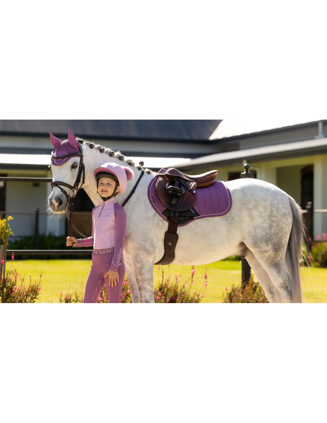 Pour une tenue harmonieuse, le tapis Mini Suede Close Contact LeMieux peut être associé à un bonnet anti-mouches Classic Mini LeMieux assorti.