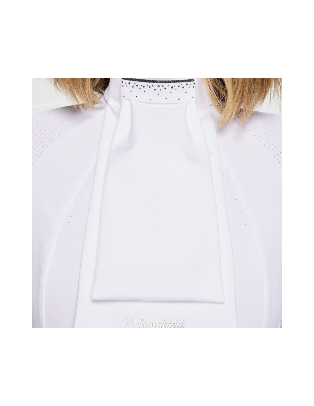 Le design du plastron est sublimé par une bande de cristaux Swarovski Crystal Fabric positionnée sur le devant, accompagnée d’un décor Swarovski délicat qui apporte une touche lumineuse et élégante. Le logo Samshield imprimé sur l’extrémité de la bavette vient signer ce modèle avec discrétion, affirmant son identité premium. L’ensemble offre une esthétique raffinée, idéale pour une allure soignée et moderne en compétition.
