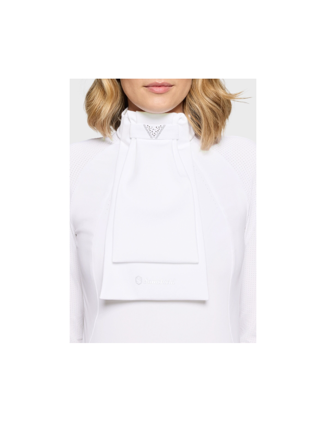 Le design du plastron est sublimé par une bande de cristaux Swarovski Crystal Fabric en forme de V sur le devant, apportant une touche lumineuse et structurée. Un décor Swarovski en triangle, positionné juste en dessous, vient renforcer l’effet graphique avec subtilité. Le logo Samshield imprimé sur l’extrémité de la bavette complète l’ensemble avec discrétion, affirmant le caractère premium de ce modèle.