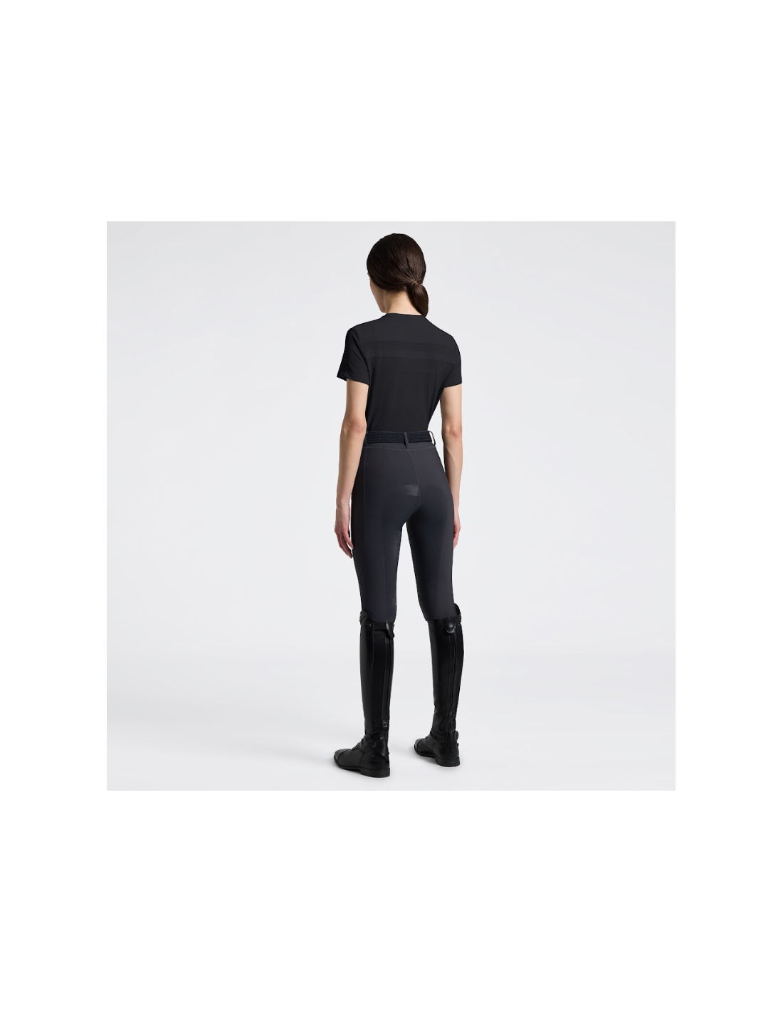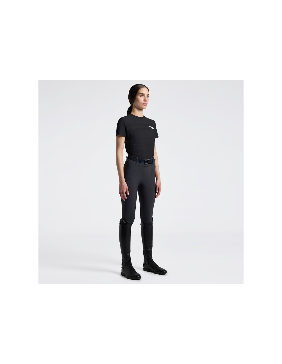 Le T-shirt présente un empiècement horizontal lisse sur la poitrine, qui crée un contraste élégant avec la texture perforée du reste du vêtement. Ce détail design apporte une touche contemporaine et sportive, tout en renforçant l’aspect esthétique du T-shirt. Le col rond côtelé et le logo Cavalleria Toscana appliqué complètent le style, offrant une allure raffinée et dynamique, idéale pour les cavalières qui recherchent à la fois performance et élégance.