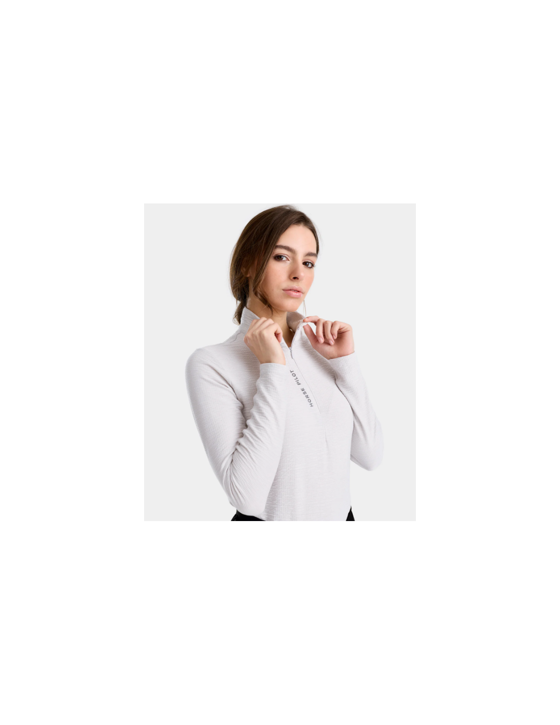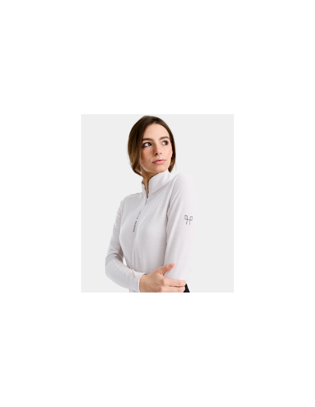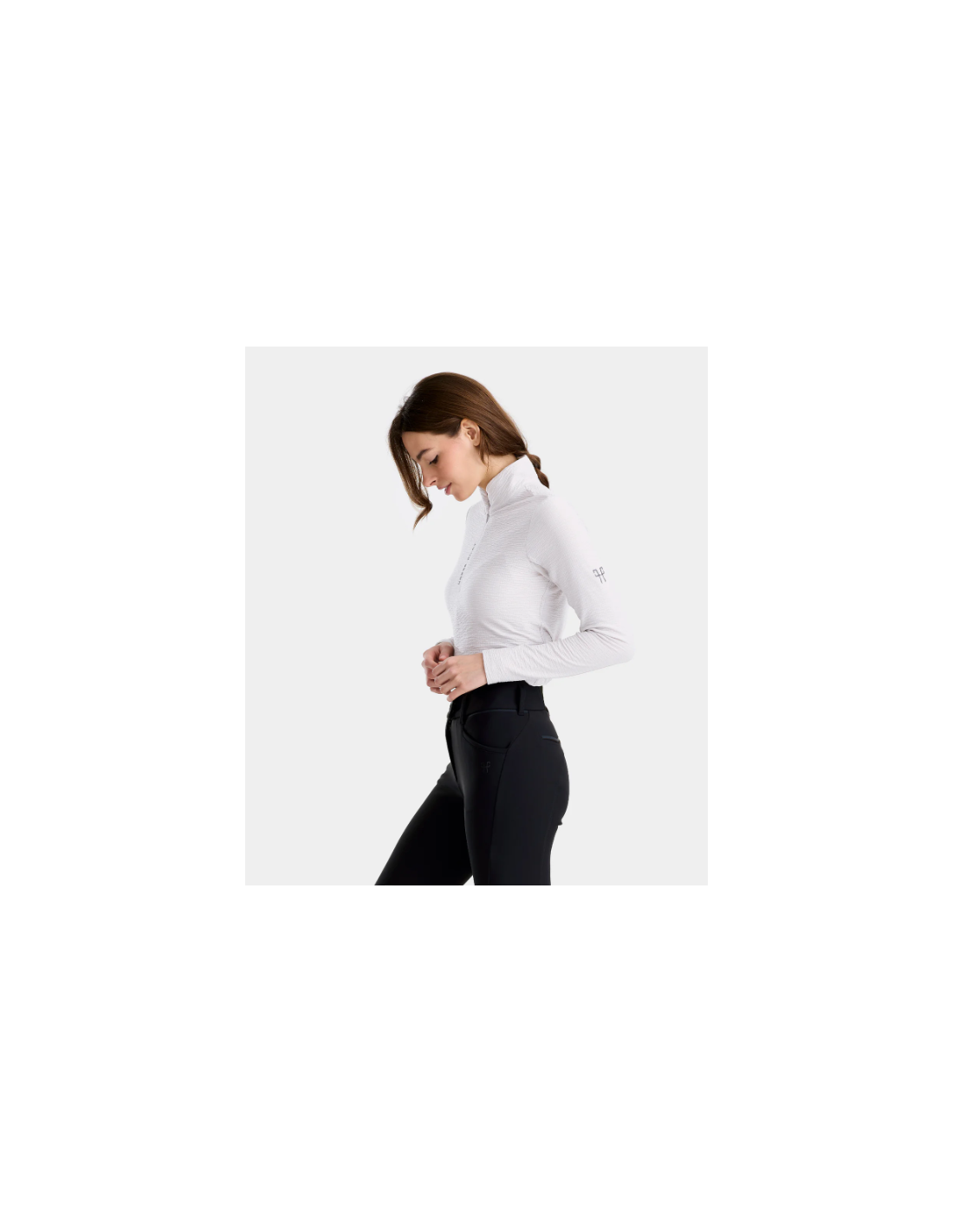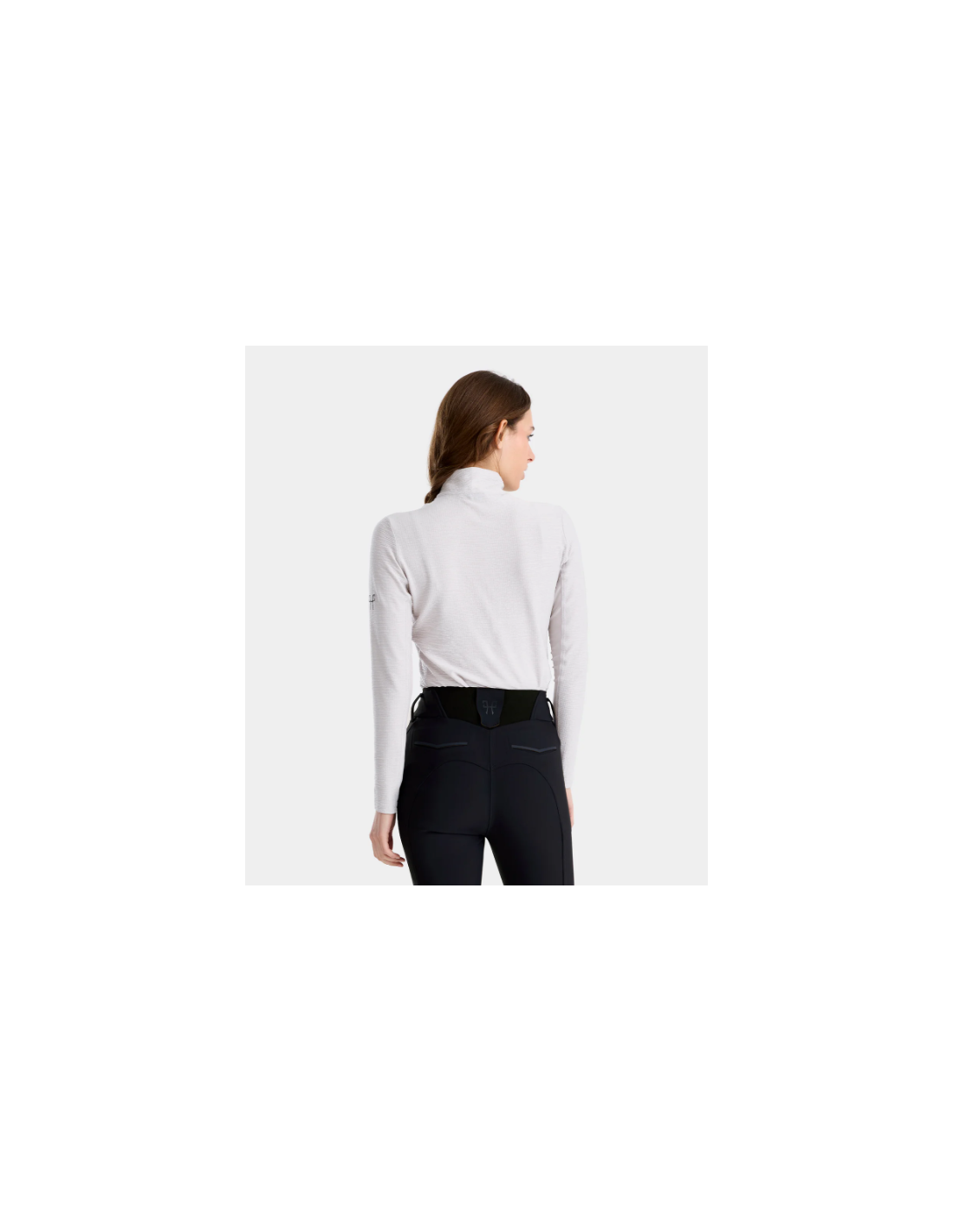 Le Suntech propose une coupe ajustée, adaptée pour être portée à l’entraînement ou sous une veste de concours. Le col haut avec ouverture partielle zippée invisible permet un ajustement facile selon les préférences de la cavalière, combinant praticité et élégance discrète.