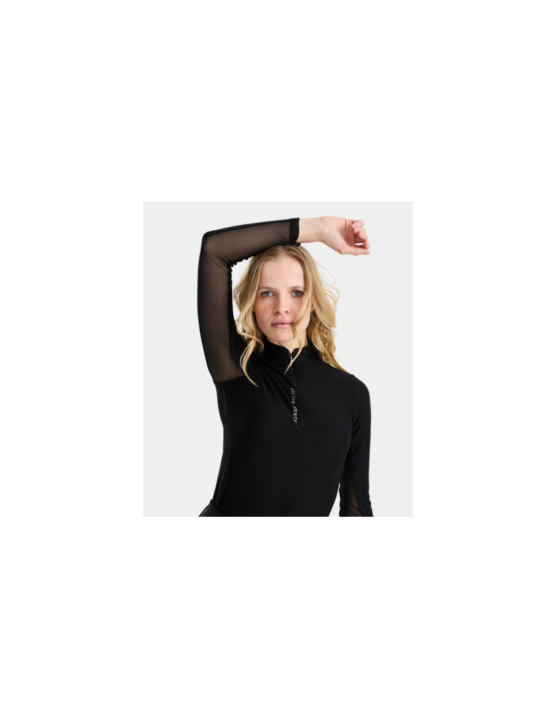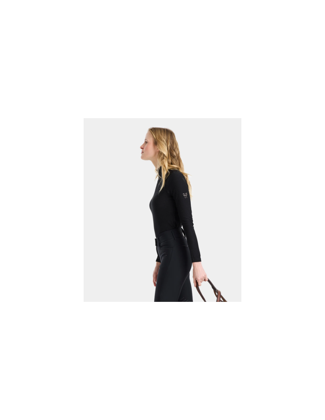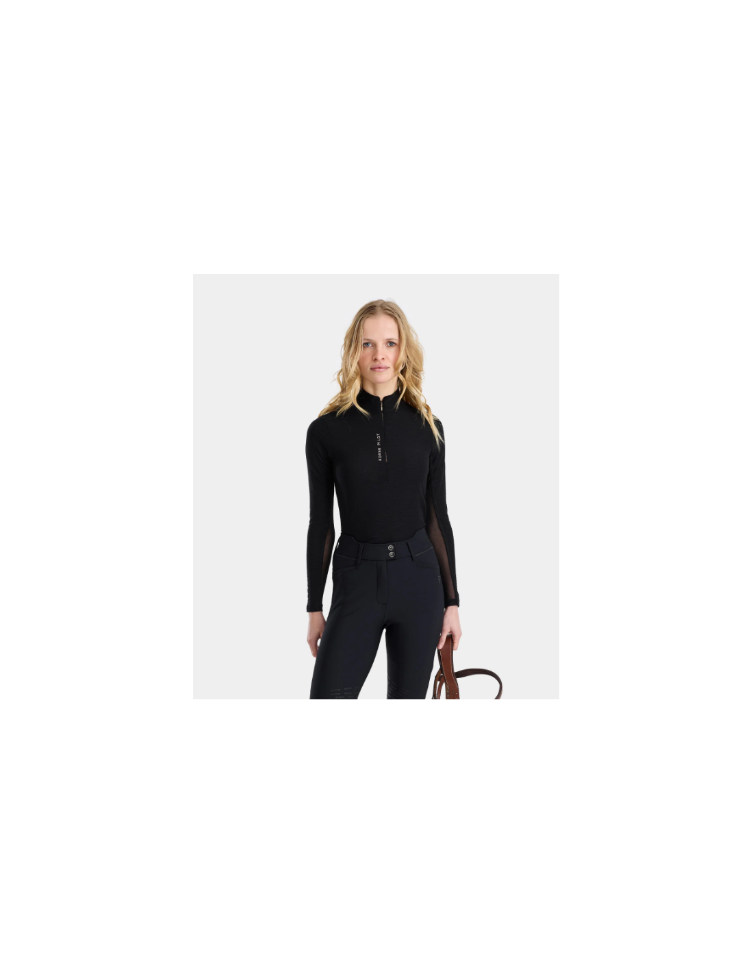 Le Suntech propose une coupe ajustée, adaptée pour être portée à l’entraînement ou sous une veste de concours. Le col haut avec ouverture partielle zippée invisible permet un ajustement facile selon les préférences de la cavalière, combinant praticité et élégance discrète.