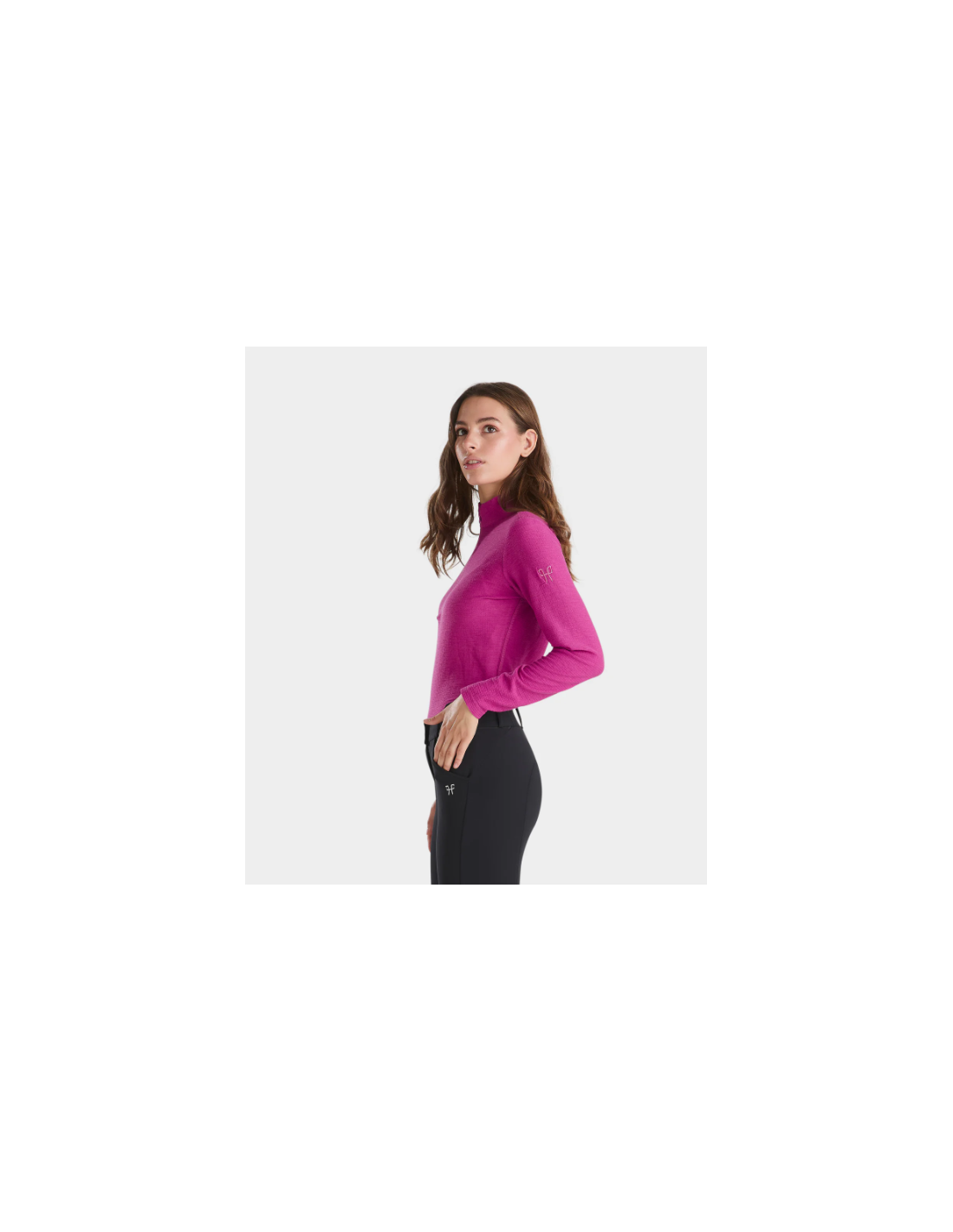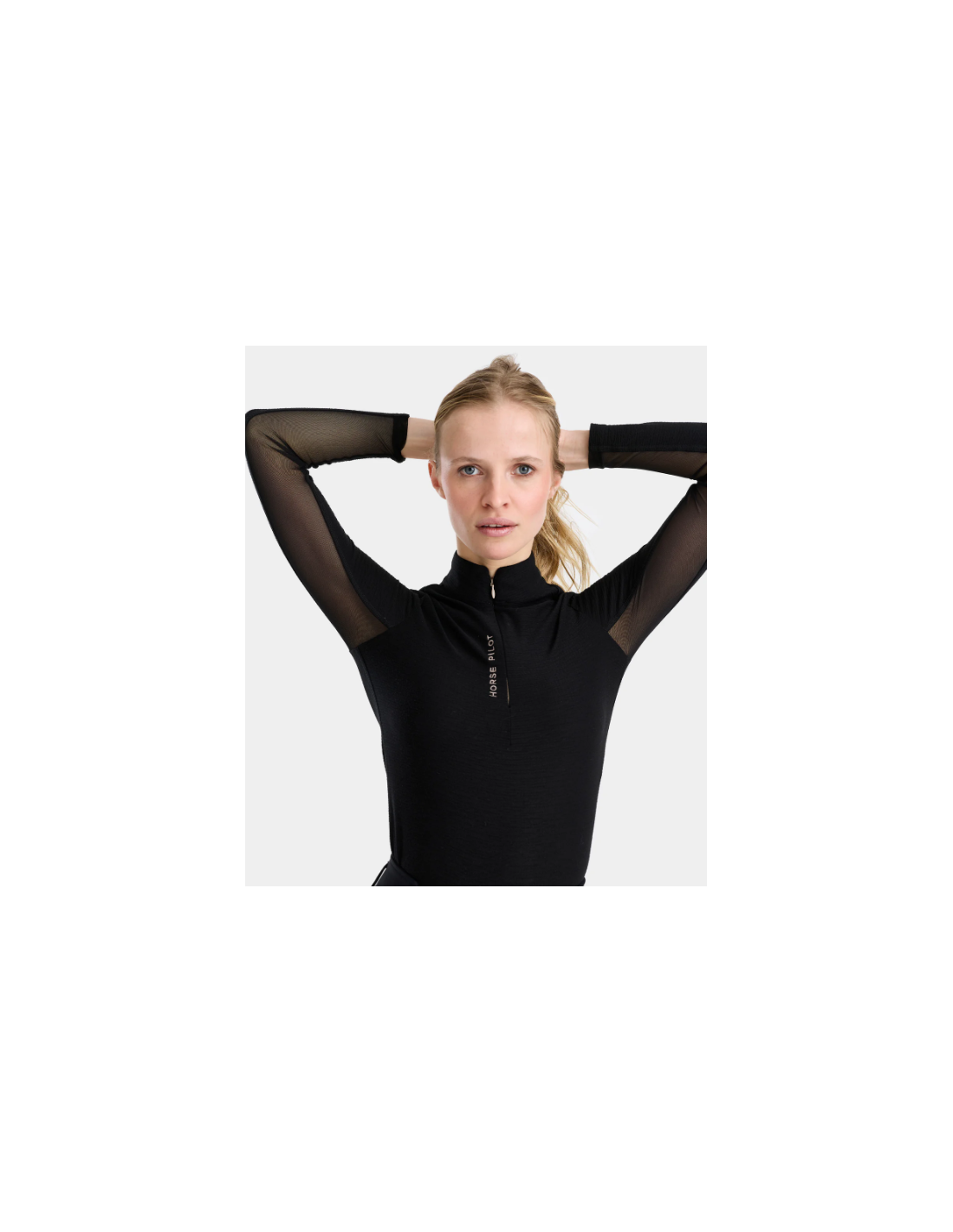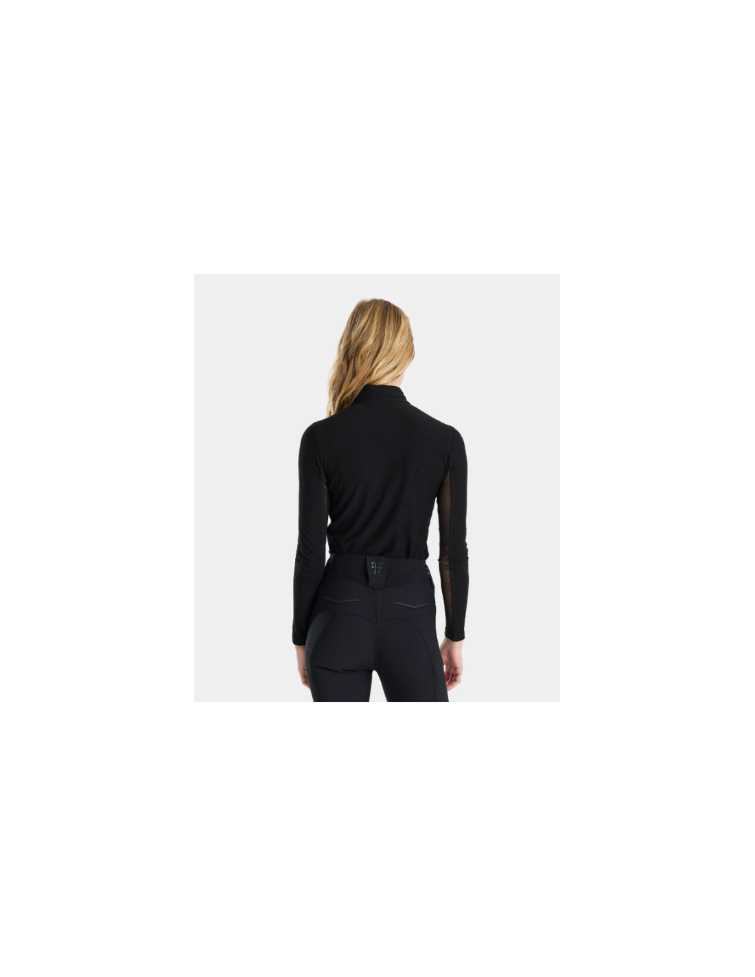 Le Suntech propose une coupe ajustée, adaptée pour être portée à l’entraînement ou sous une veste de concours. Le col haut avec ouverture partielle zippée invisible permet un ajustement facile selon les préférences de la cavalière, combinant praticité et élégance discrète.