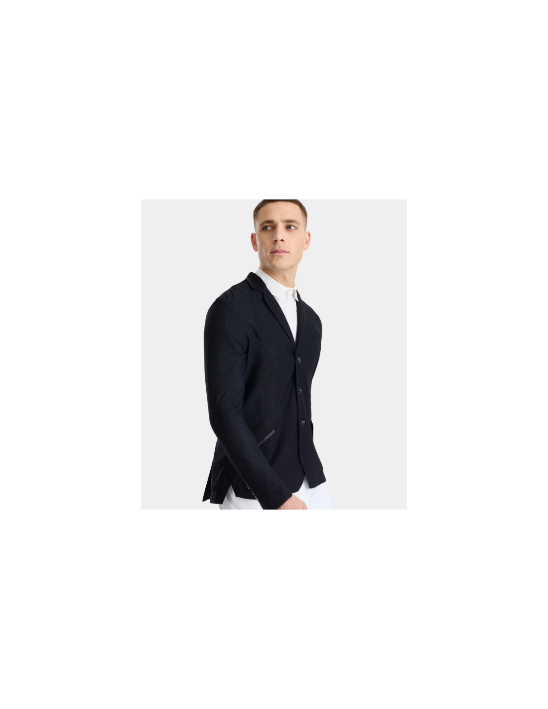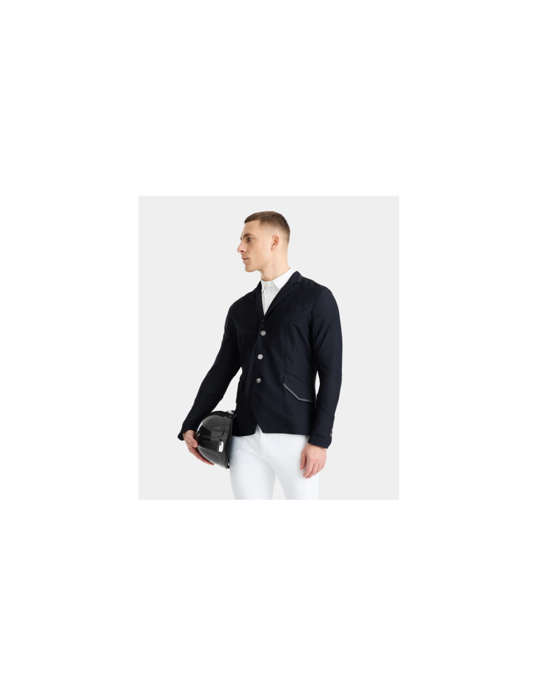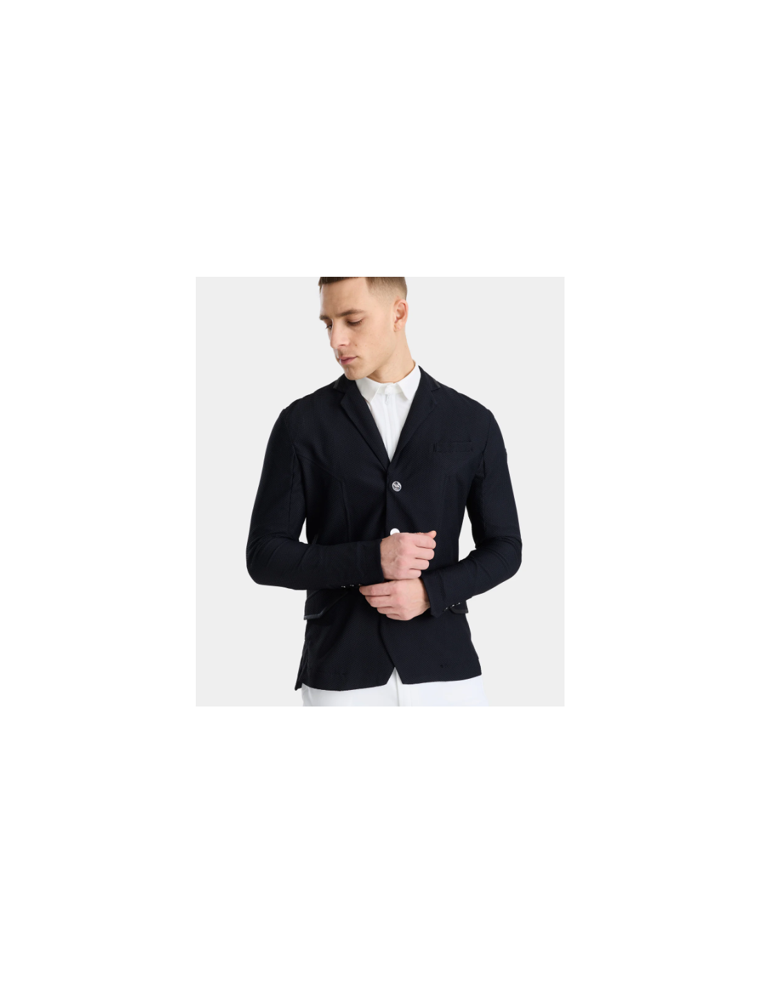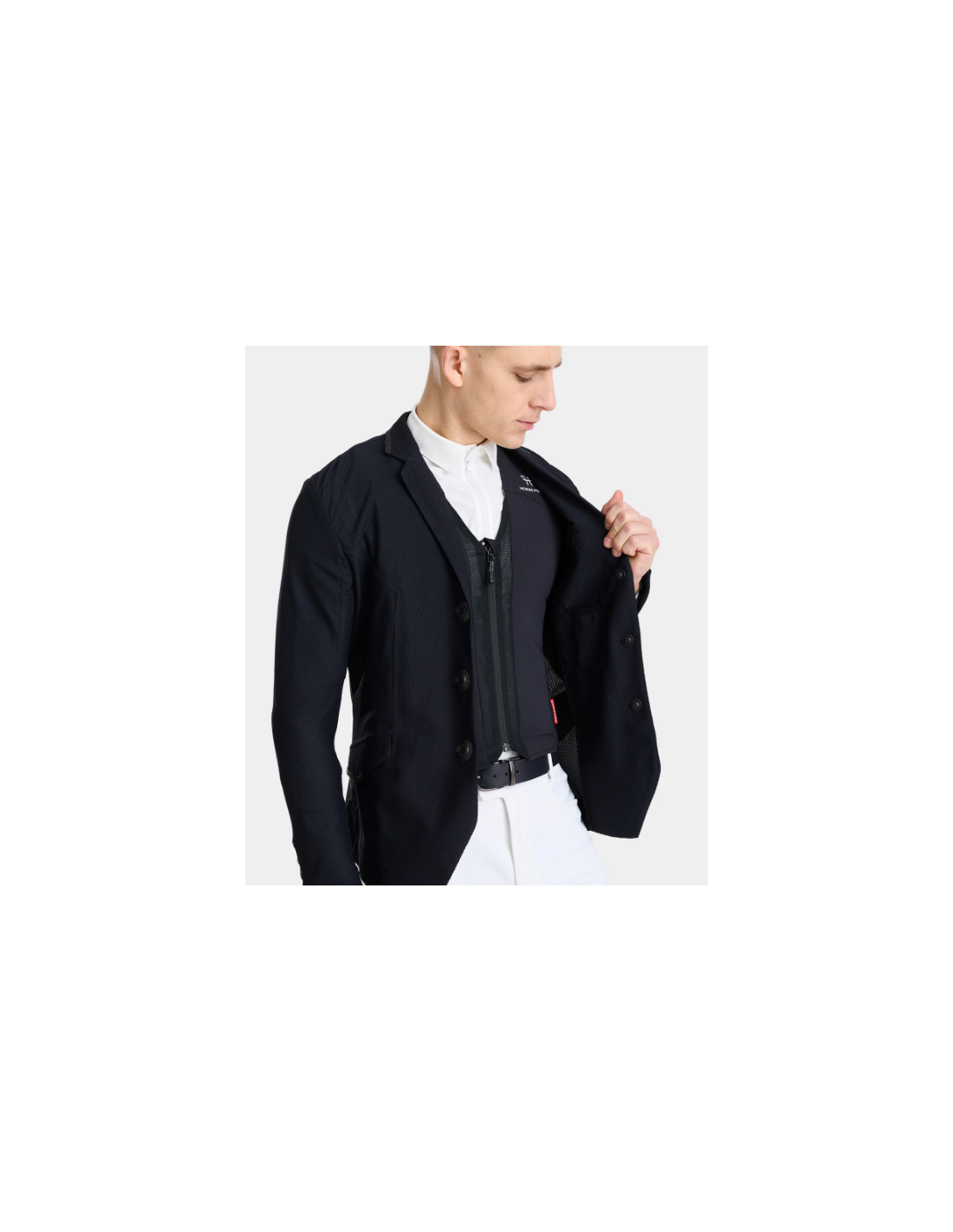 Alliant performance et style, la veste présente un col tailleur réglementaire et un logo ton-sur-ton discret, pour un rendu élégant et conforme aux normes des concours. Les boutons magnétiques interchangeables ajoutent une touche pratique et esthétique, tandis qu’une poche intérieure permet de ranger facilement téléphone, start list ou petits accessoires.