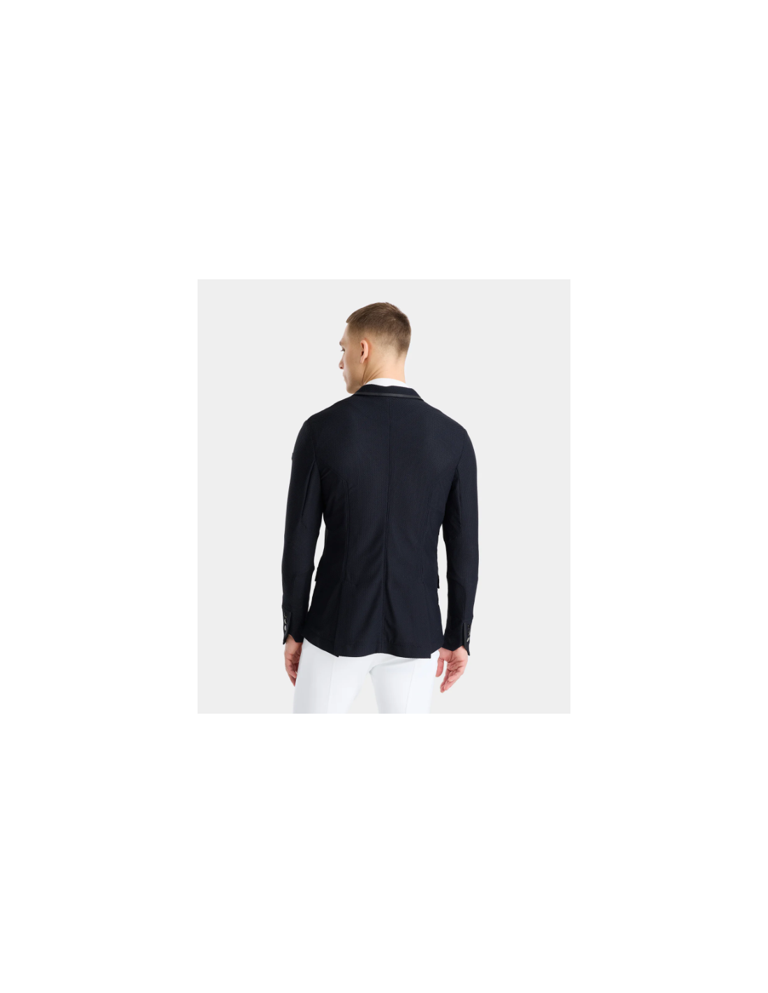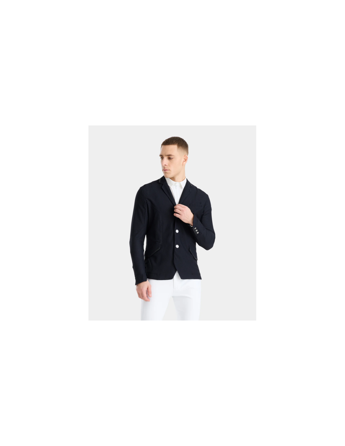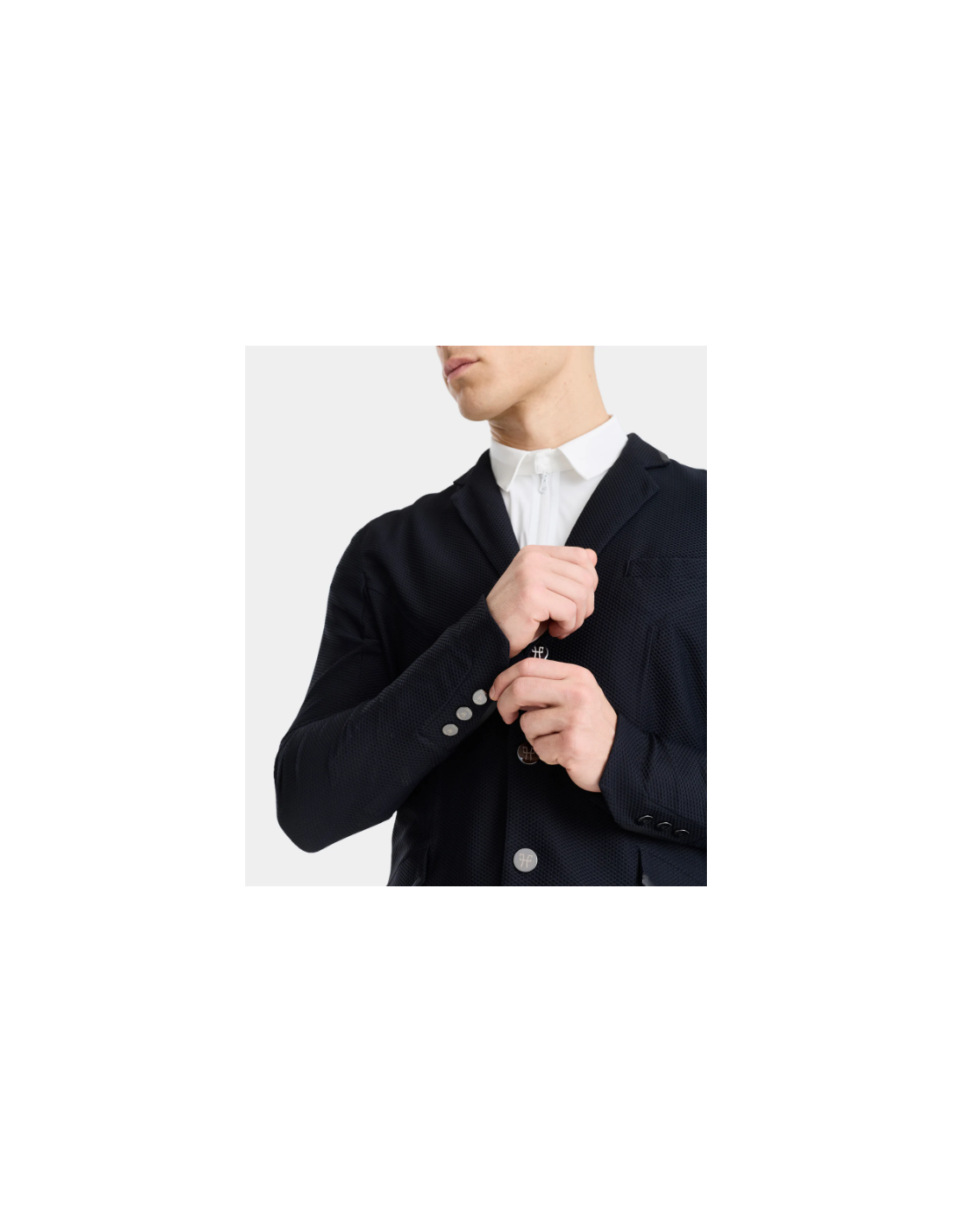 Alliant performance et style, la veste présente un col tailleur réglementaire et un logo ton-sur-ton discret, pour un rendu élégant et conforme aux normes des concours. Les boutons magnétiques interchangeables ajoutent une touche pratique et esthétique, tandis qu’une poche intérieure permet de ranger facilement téléphone, start list ou petits accessoires.