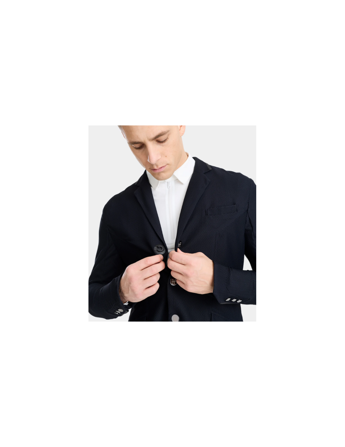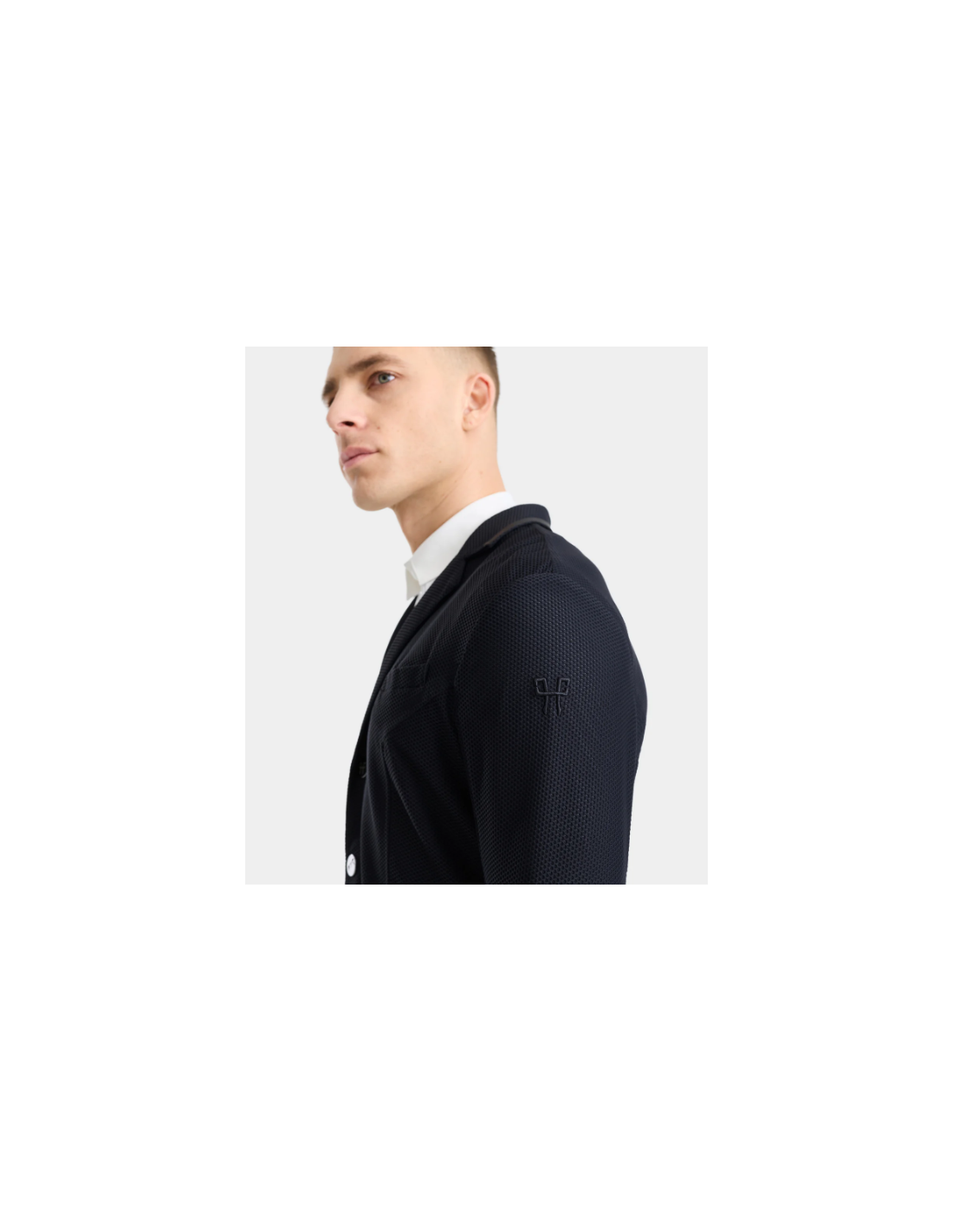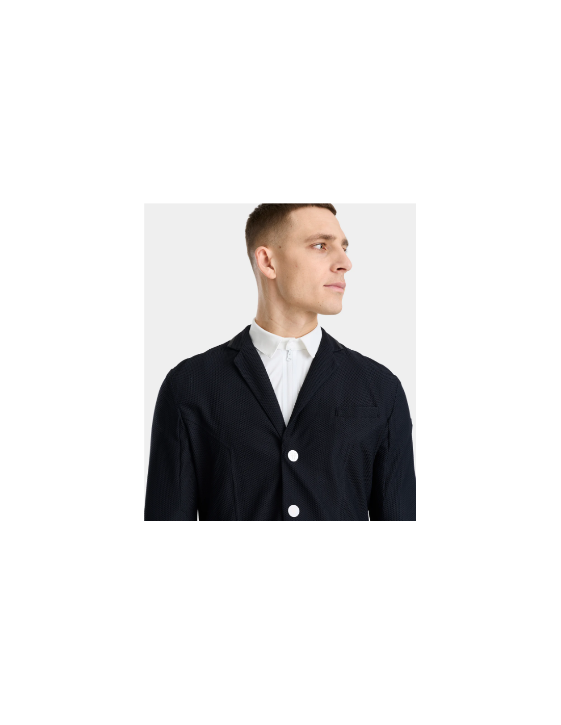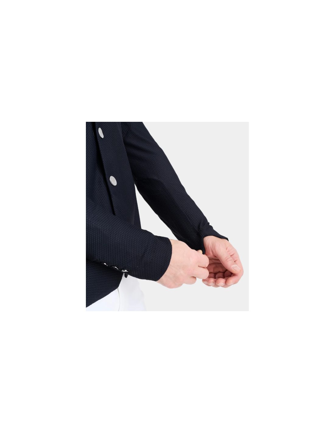 Alliant performance et style, la veste présente un col tailleur réglementaire et un logo ton-sur-ton discret, pour un rendu élégant et conforme aux normes des concours. Les boutons magnétiques interchangeables ajoutent une touche pratique et esthétique, tandis qu’une poche intérieure permet de ranger facilement téléphone, start list ou petits accessoires.