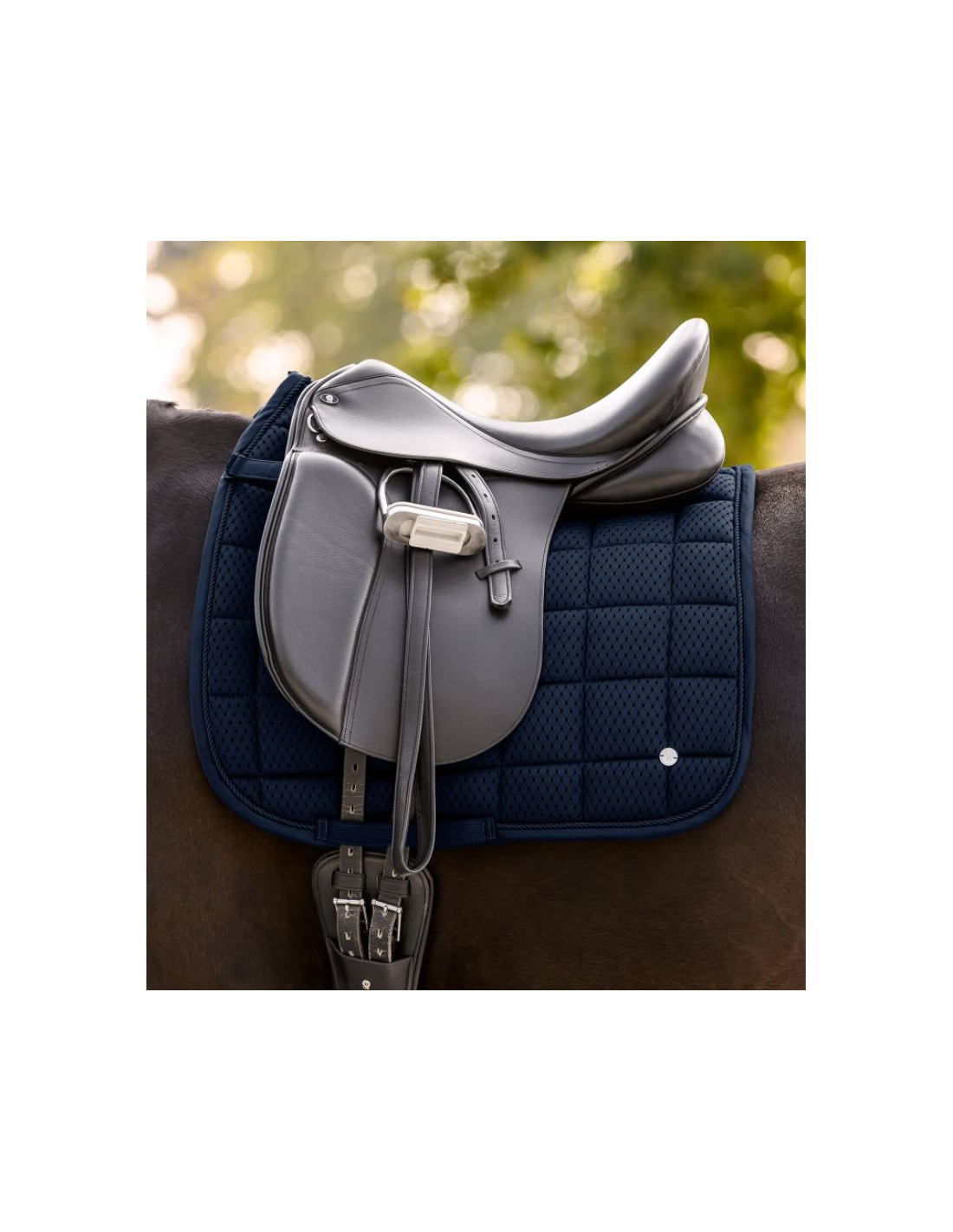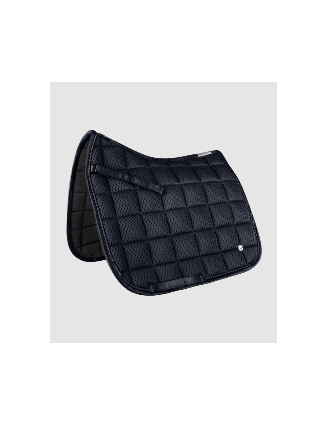 Avec son cordon ton sur ton et sa plaquette en métal argenté, ce tapis présente une esthétique sobre et raffinée, parfaitement adaptée à la discipline du dressage. Ses finitions soignées apportent une touche d’élégance tout en conservant une grande fonctionnalité.