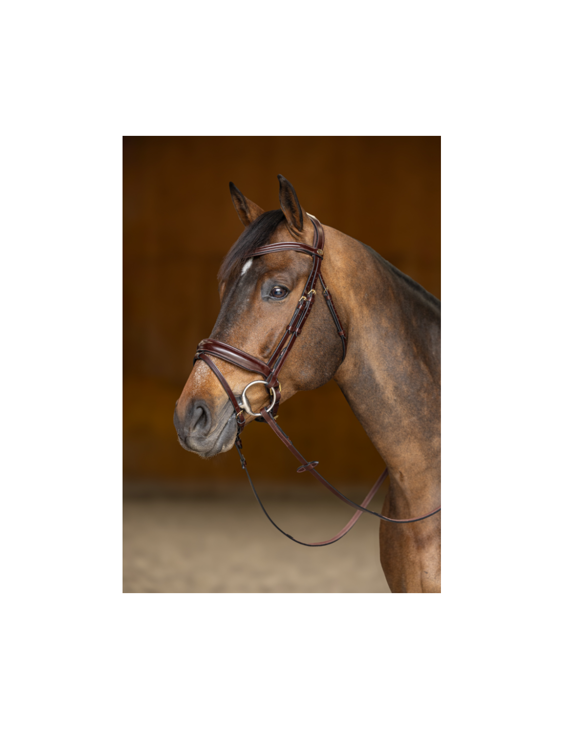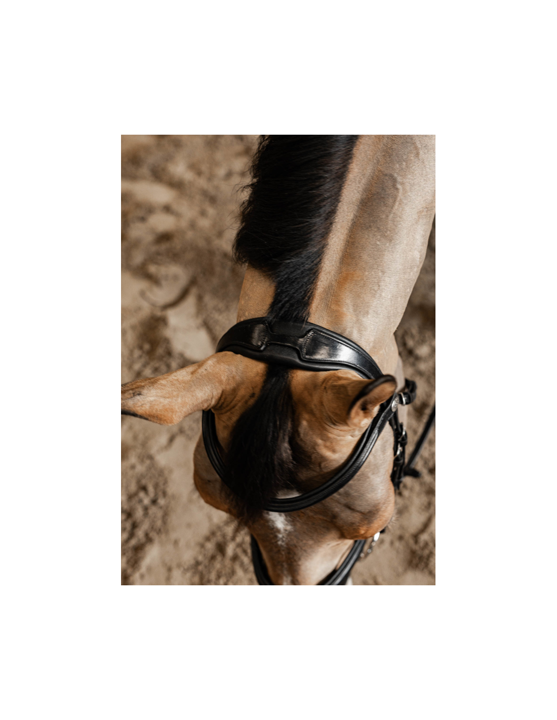 Le frontal anatomique, également rembourré et doublé de cuir souple, complète l’ensemble en apportant un confort supplémentaire au niveau du front. Il contribue à une bonne stabilité du bridon tout en limitant les frottements sur les zones sensibles.